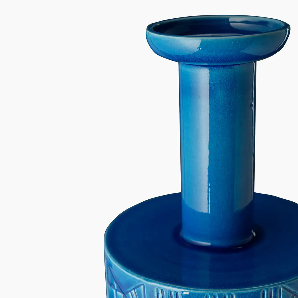 Captivating in its simplicity, this superb vase by British designer Bethan Laura Wood is crafted of white clay using the slip casting technique. The tall bottle shape showcases a rounded base raised on a circular plinth and a flat shoulder with a cylindrical neck and flared lip. The body's surface is embellished with engravings inspired by Mexico City’s New Basilica of Our Lady of Guadalupe, whose earthy pattern and dynamic movement is enhanced by the superb turquoise crystalline glaze. This exclusive vase will enliven a modern and rustic-chic decor with its organic elegance.