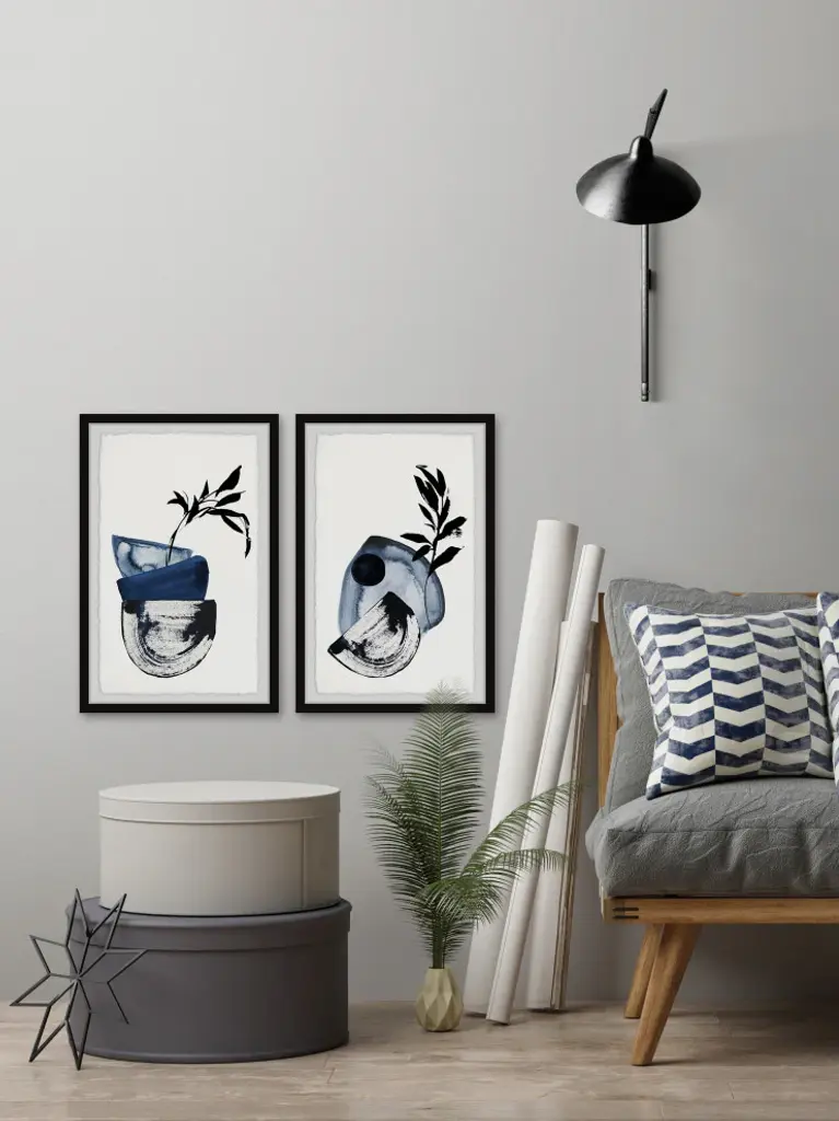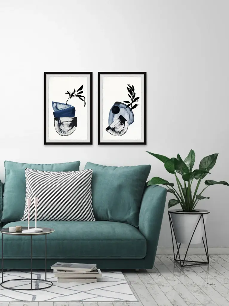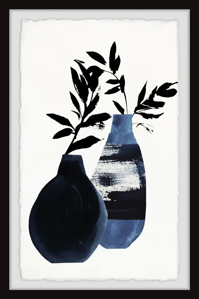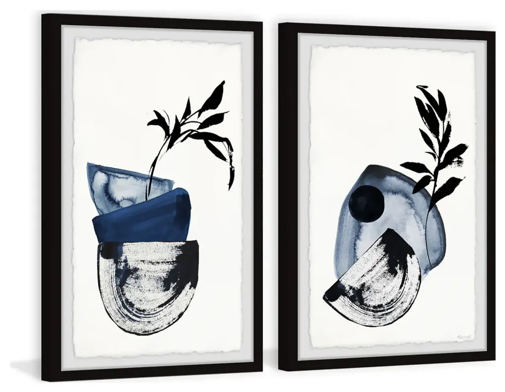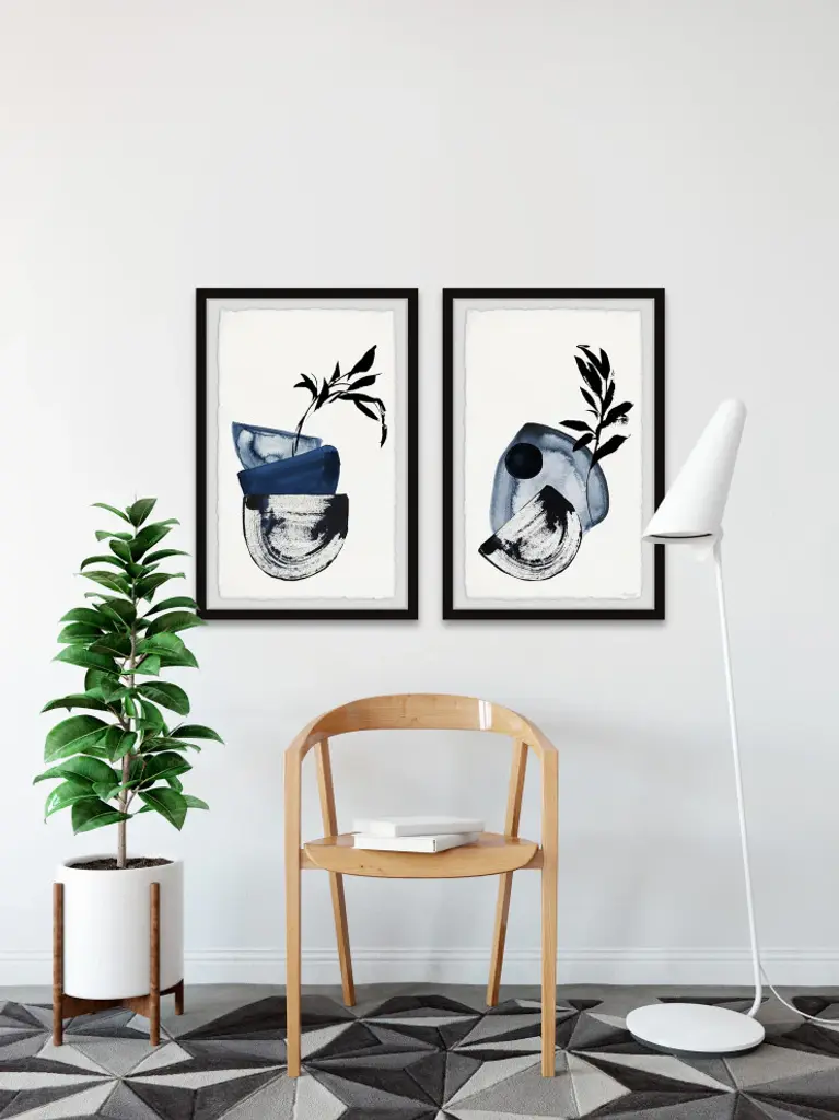 Turn any bare wall into a contemporary focal point by putting this duo of watercolor painting prints on display. These black, blue, and white prints feature a geometrical, abstract take on potted plants. Proudly printed in the USA, this piece is printed on high quality archive paper and professionally hand-framed. With wall-mounting hooks included, this artful accent is ready to hang up as soon as it reaches your front door.- (2) panels of 20x30- Top quality Giclee print on high resolution Archive Paper- Hand cut deckled edges- High quality durable non-warping frame- Finished under shatter resistant plexiglass- Arrives ready to hang- Includes a certificate of authenticity- Printed in the USA