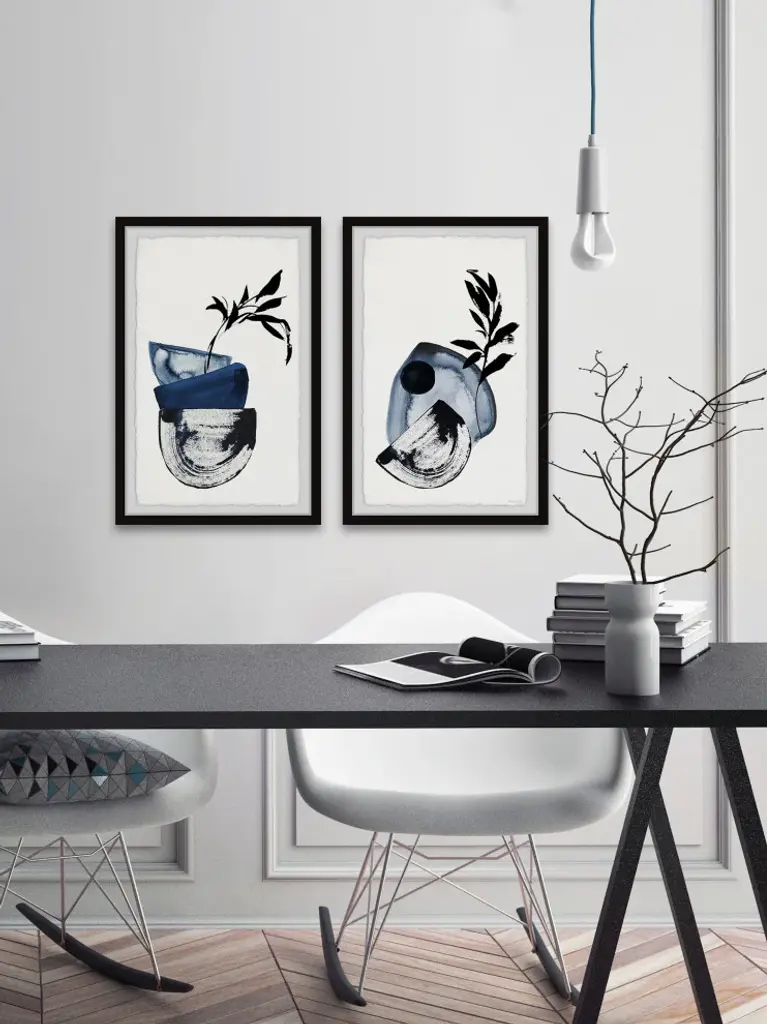 Turn any bare wall into a contemporary focal point by putting this duo of watercolor painting prints on display. These black, blue, and white prints feature a geometrical, abstract take on potted plants. Proudly printed in the USA, this piece is printed on high quality archive paper and professionally hand-framed. With wall-mounting hooks included, this artful accent is ready to hang up as soon as it reaches your front door.- (2) panels of 8x12- Top quality Giclee print on high resolution Archive Paper- Hand cut deckled edges- High quality durable non-warping frame- Finished under shatter resistant plexiglass- Arrives ready to hang- Includes a certificate of authenticity- Printed in the USA