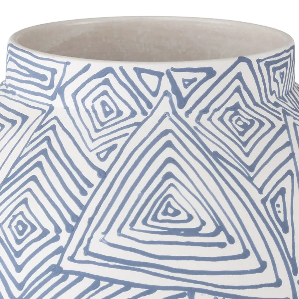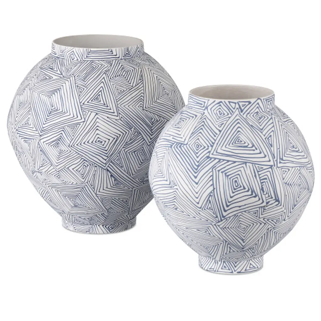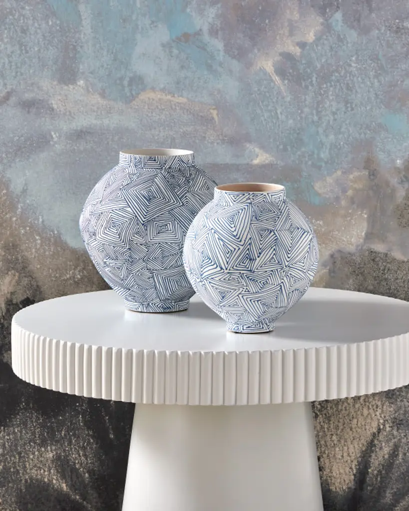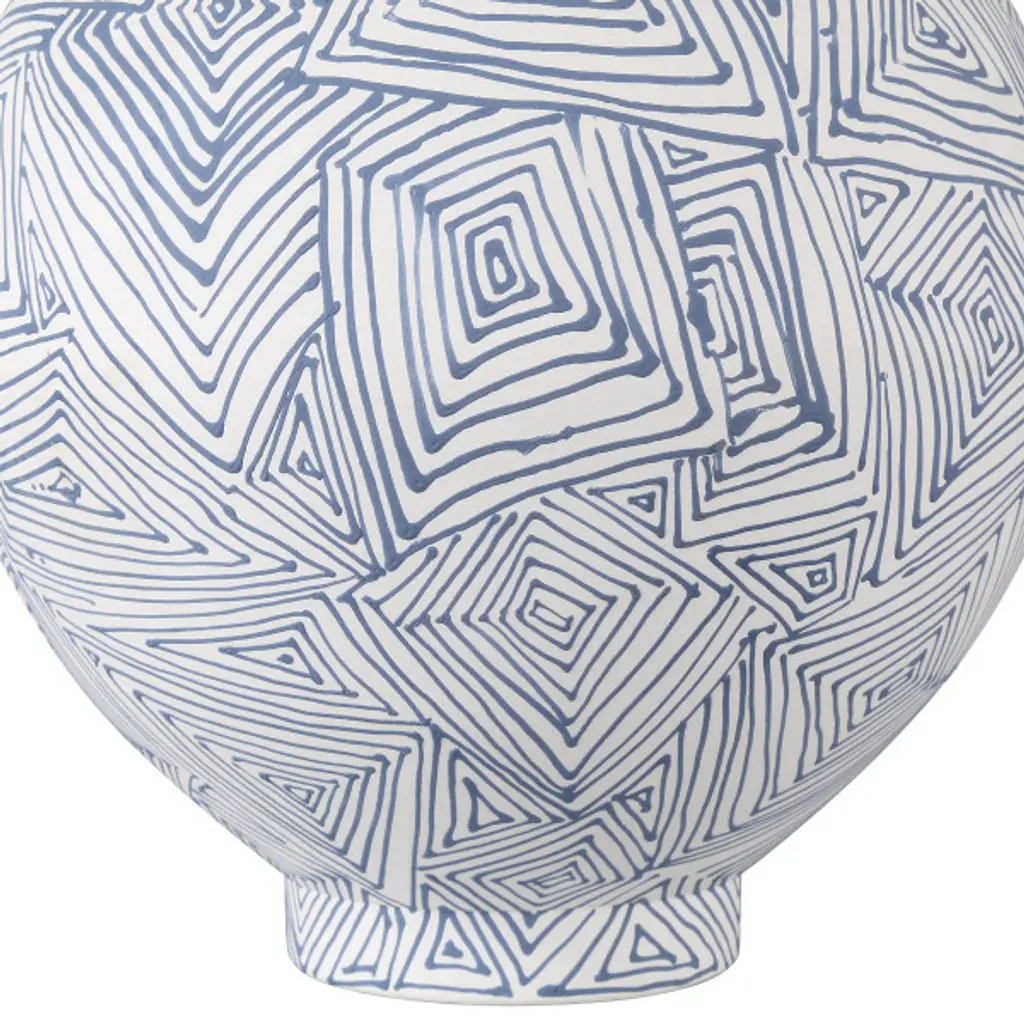 The vase is made of hand-thrown porcelain that has been hand-glazed and decorated individually. The vessel is also glazed on the inside. The telescoping pattern on the surface, which was inspired by the art of Imperial Japan, is slightly raised to create an added element of artisanal craftsmanship to each piece, which will vary slightly from being handmade.