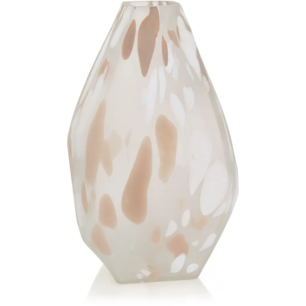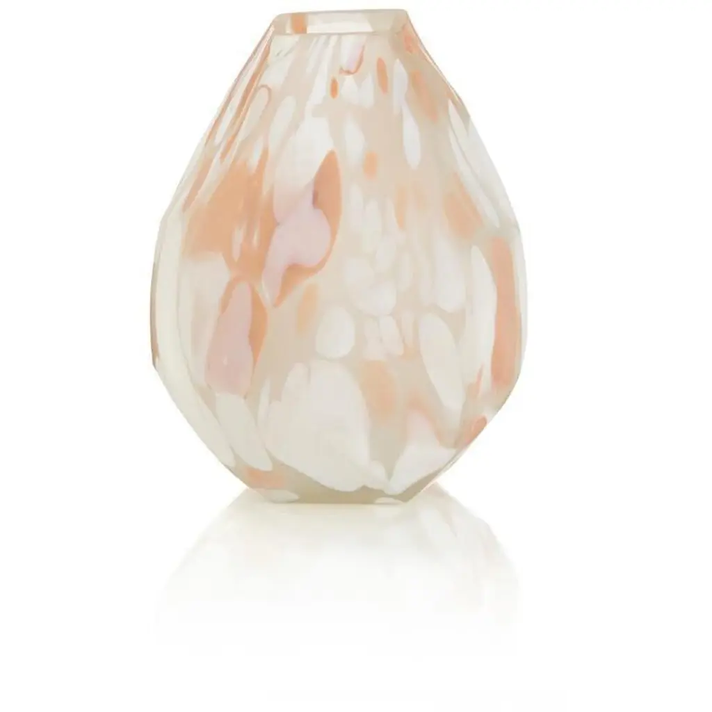 This modern abstract handblown glass vase is pieced together with mosaics of white, blush and ivory.