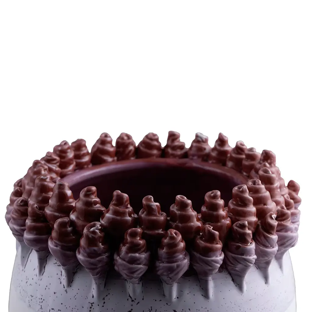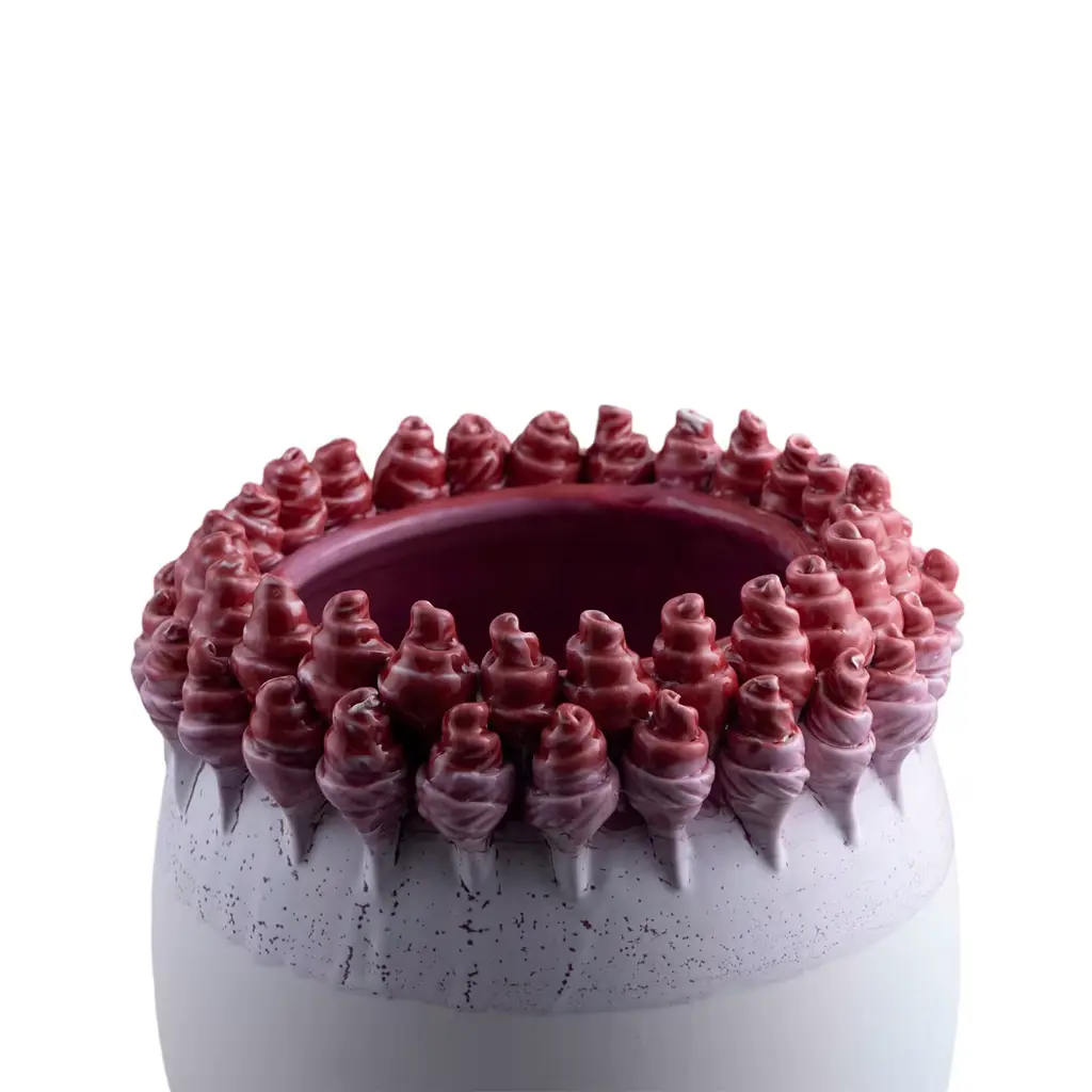 A refined tall vase featuring an elegant design adorned with numerous delicate rose buds. Its glossy pink interior contrasts beautifully with the soft, matte white enamel finish, creating a timeless piece that adds a touch of sophistication to any space. Perfect for showcasing fresh blooms or as a standalone statement decor item.