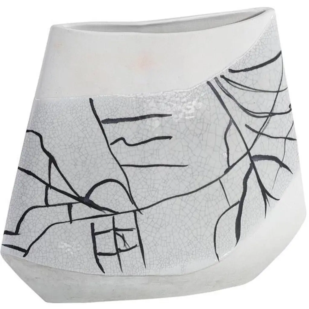 The Boceto Vase is a gorgeous decorative vessel with a sleek, contemporary design. Crafted from porcelain, the white vase showcases a two-toned look between glazed and unglazed surfaces. The glazed portion features a crackle effect, overlain with sinuous black lines with a hand-sketched look.