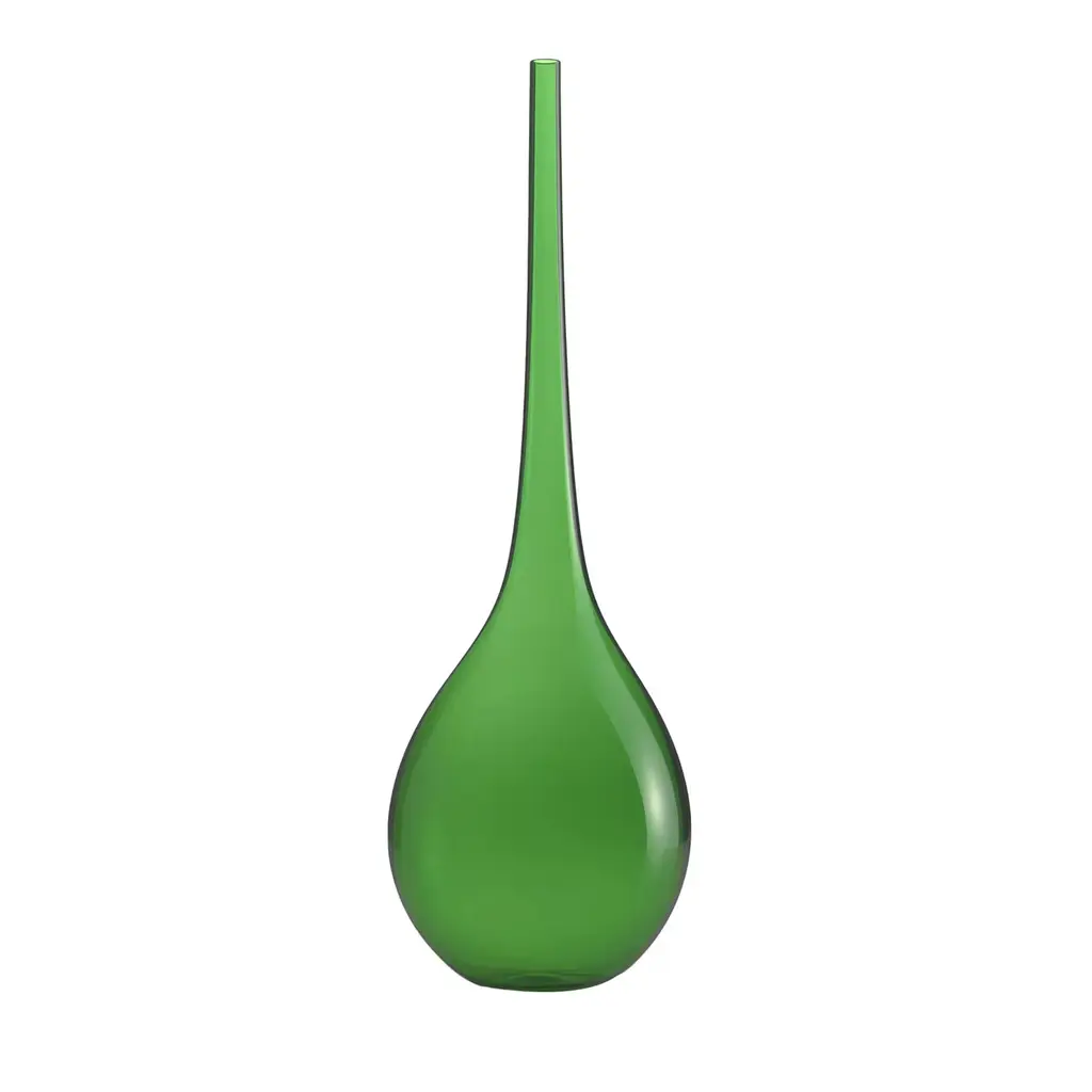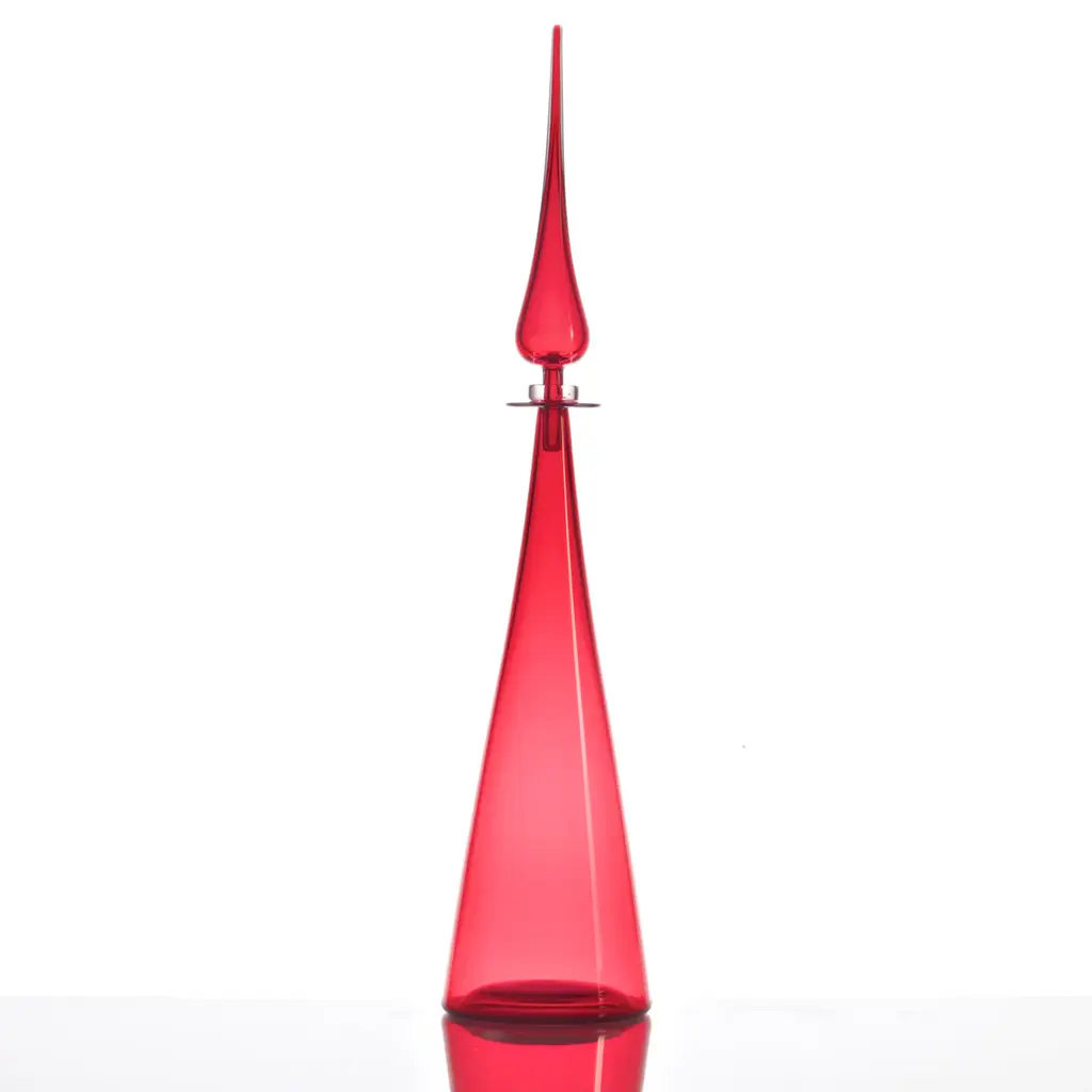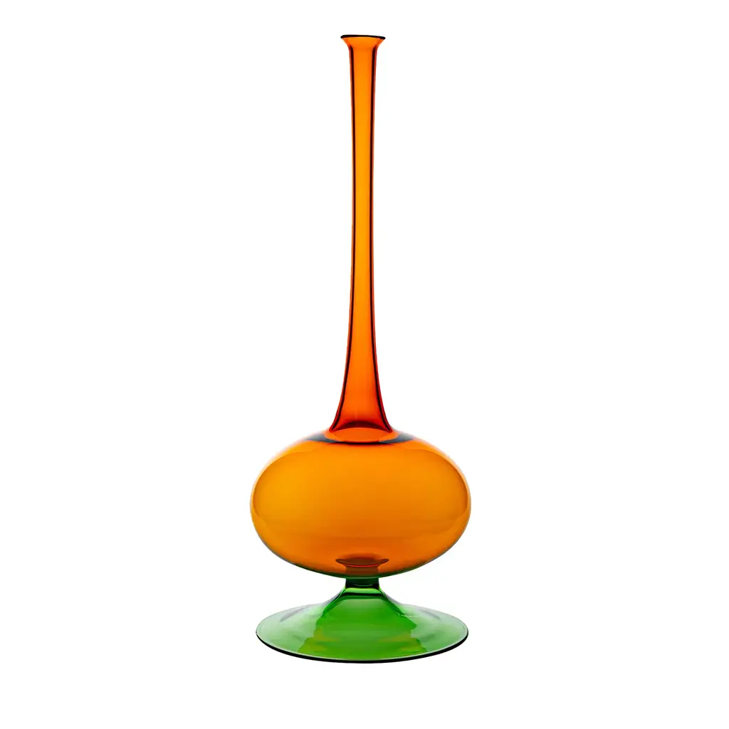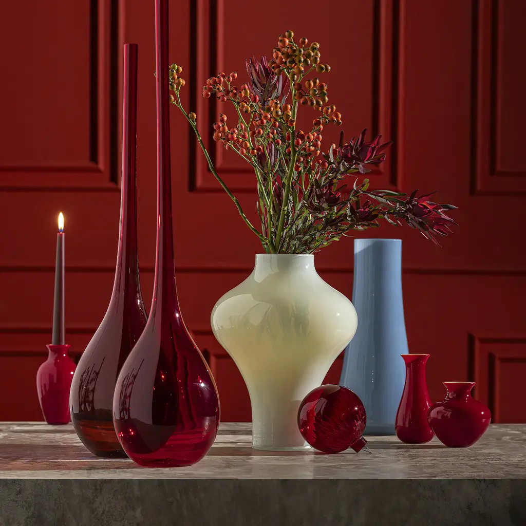 A dramatically tapered and elongated neck immediately states the decorative nature of this precious Murano glass vase. Offered in a seductive bright-red hue, it belongs to the Bolle Collection of singular pieces masterfully mouth-blown and finished by hand. The exclusive artisan crafting process implies slight variations that should be treasured as proof of exclusivity.