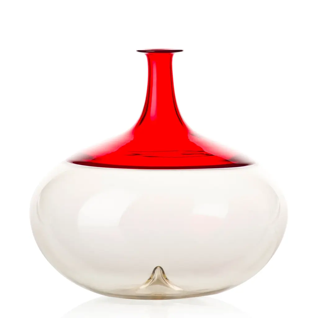 Originally designed in 1966 by Finnish designer Tapio Wirkkala, this vase is characterized by a rounded shape and bi-color finish. The mouth-blown glass is handmade using the "incalmo" technique, which fuses the colored glass components into a single piece. The highly graphic design with contrasting colors creates a strong optical presence of great aesthetic quality.