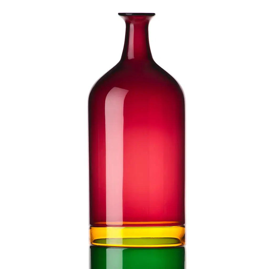 Designed by Tapio Wirkkala for Venini in 1966, this mouth-blown vase boasts a bi-color bottle-shaped silhouette handmade with the "incalmo" technique. Marked by a central band in golden yellow, the vivid red top and hunter green bottom are joined together while the glass is still hot in a seamless piece of strong visual impact.