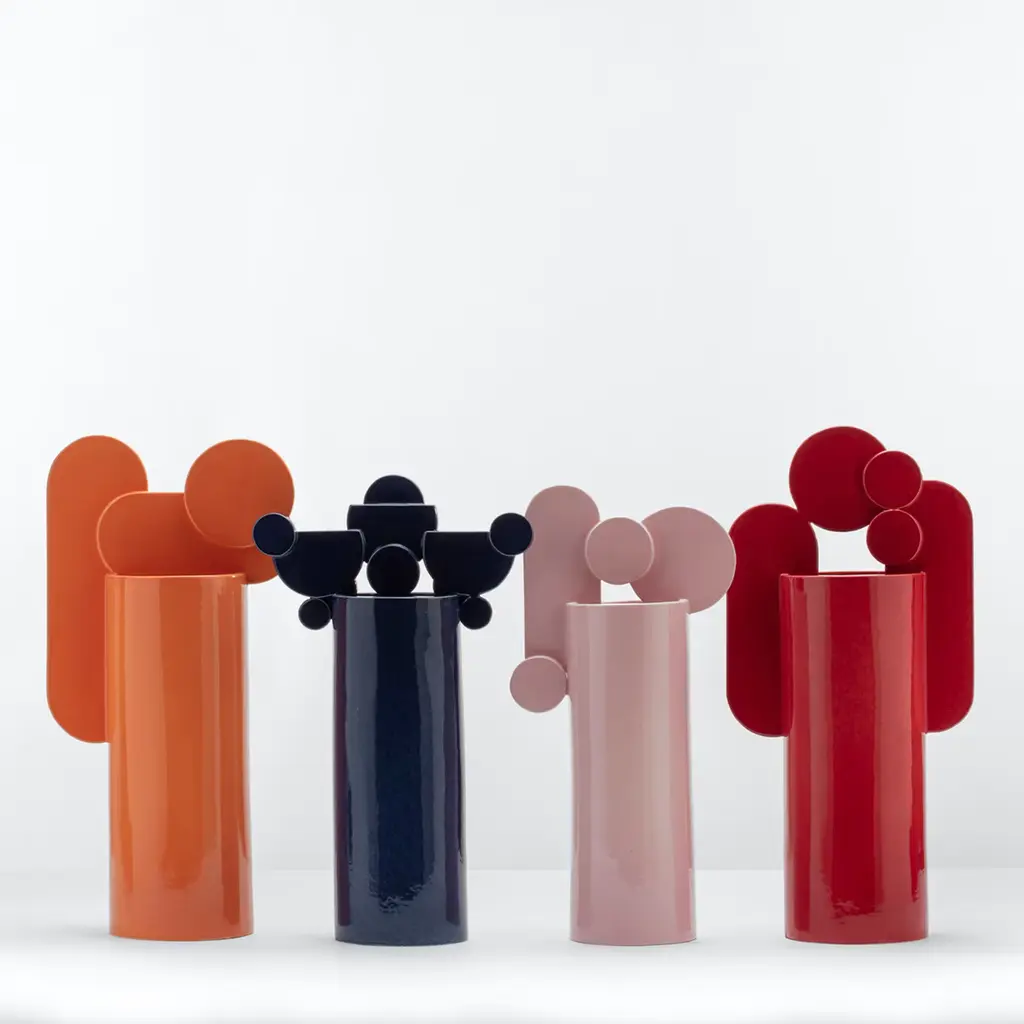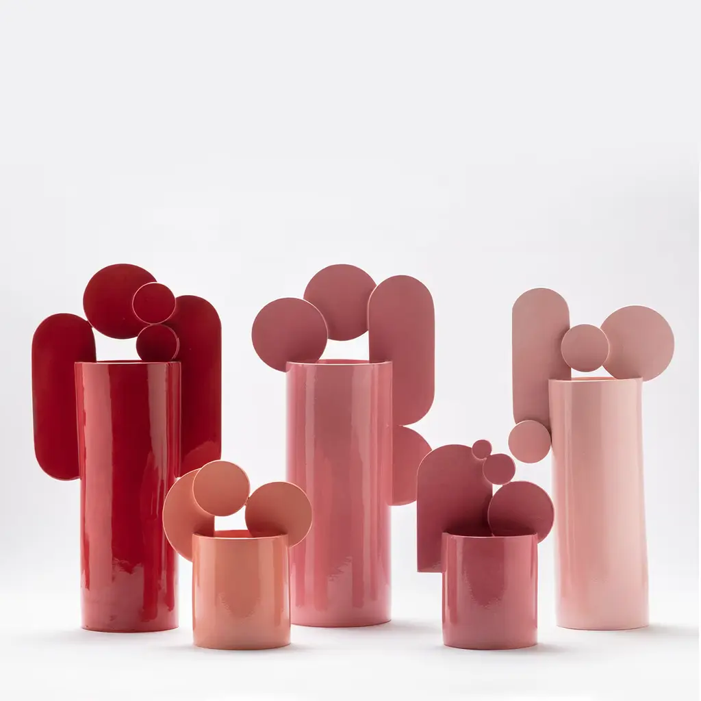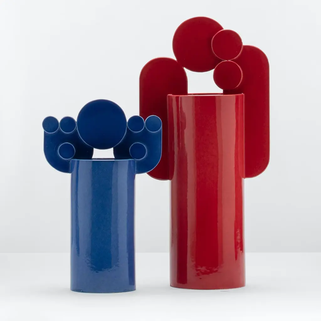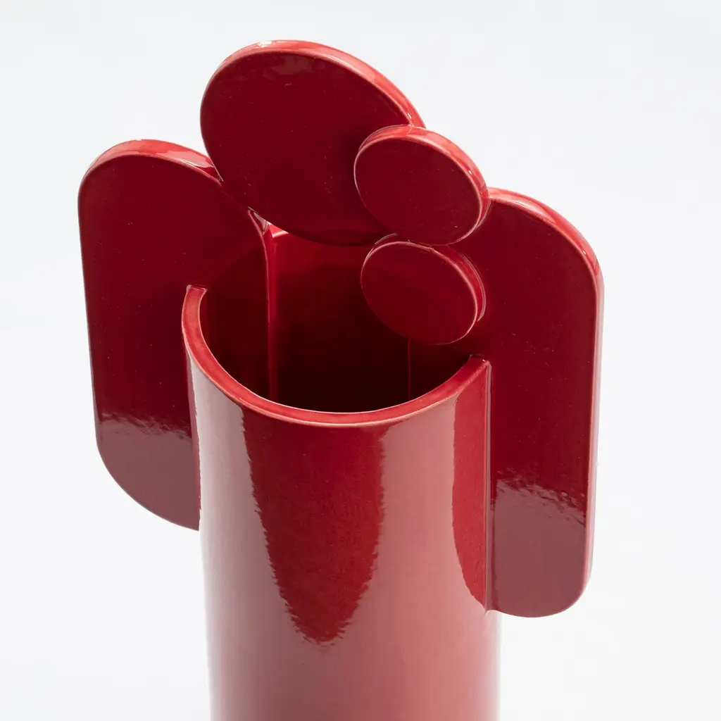 This marvelous ceramic vase, with its intense red enamel and little transparencies, celebrates the warmth of the Renaissance porticos in Bologna and the irregular charm of their uneven characteristics. Part of the Bubble Family Collection, the piece displays elements as circles, cylinders, and arches smartly arranged in a contemporary design that reflects a rare artistic sensibility.