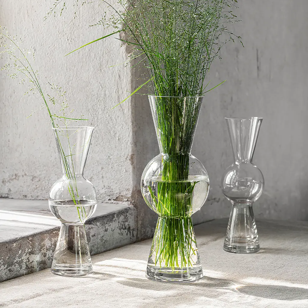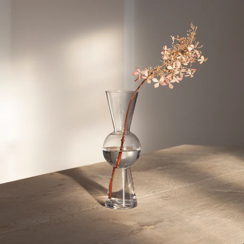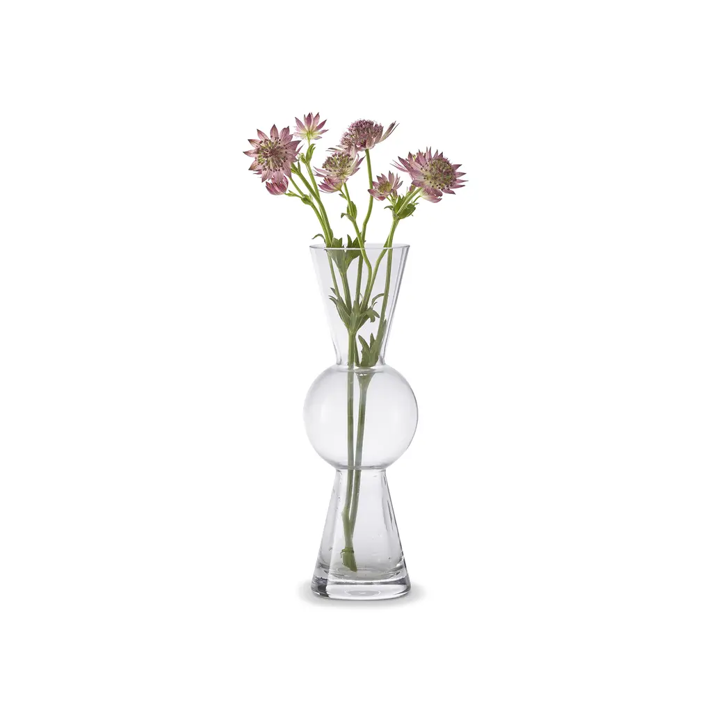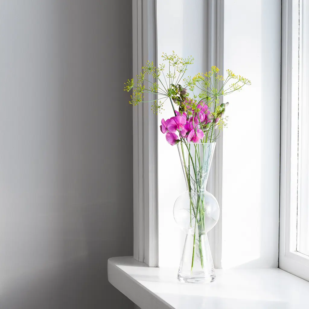Sweet and pretty, the BonBon Vase transforms flowers into a fun decorative accent on a table, shelf, or windowsill. Created by Swedish designer Eva Schildt for Design House Stockholm, this quirky vase draws inspiration not only from the eponymous wrapped treats, but also from ancient amphorae. The playful candy-like shape combines a conical base and neck with a globe-like body, resulting in an eye-catching home accessory that looks fantastic with or without flowers. Handmade from glass, the BonBon Vase is entirely transparent and comes in different sizes to suit a variety of flower arrangements, from single stems and small plants to large bouquets.
