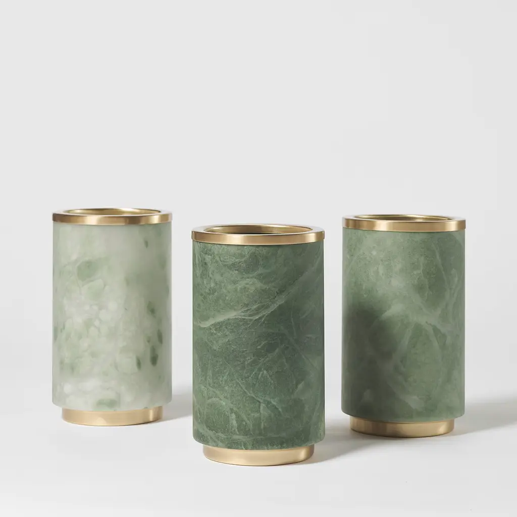 The Borealis vase showcases an exquisite blend of green alabaster and satin brass, creating a striking focal point for any space. Its cylindrical shape emphasizes minimalist elegance, while the natural veining of the alabaster introduces an organic pattern that is unique to each piece. The smooth satin brass rim enhances the vase's sophistication, adding a warm touch that complements its luxurious aesthetic. Ideal for modern interiors, this decorative vase is perfect for displaying floral arrangements or standing alone as a timeless piece of art.