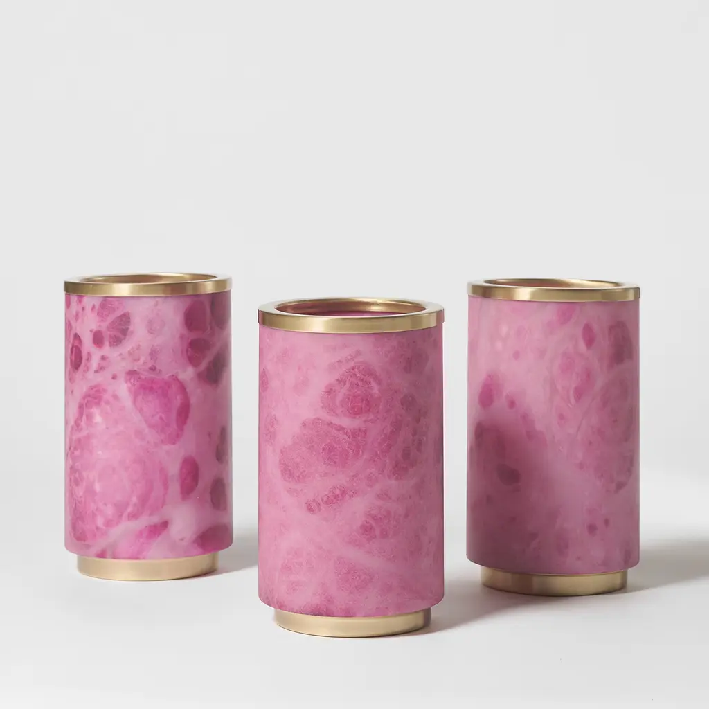 Elevate home aesthetics with the Borealis vase, a stunning fusion of pink alabaster and satin brass. Its cylindrical design embodies a minimalist elegance, making it an ideal centerpiece for any interior space. The unique veining in the alabaster showcases an organic beauty, providing each vase with a distinctive character. The smooth satin brass rim introduces a touch of warmth and sophistication, enhancing the overall luxurious feel of this decorative piece. Perfect for complementing floral arrangements or standing alone as a statement object, this vase is a delightful addition to upscale home décor.