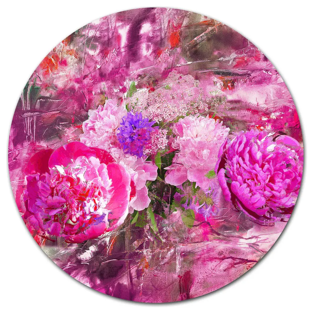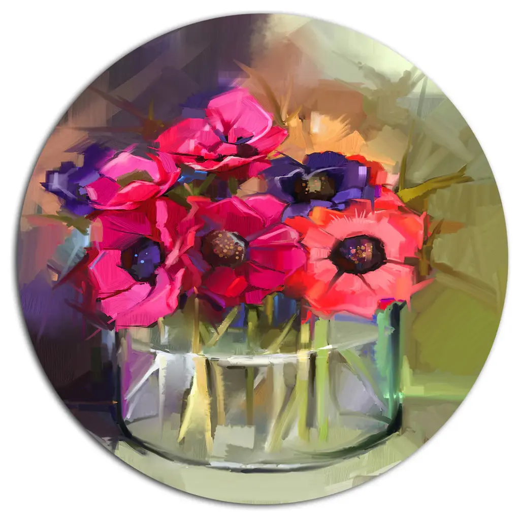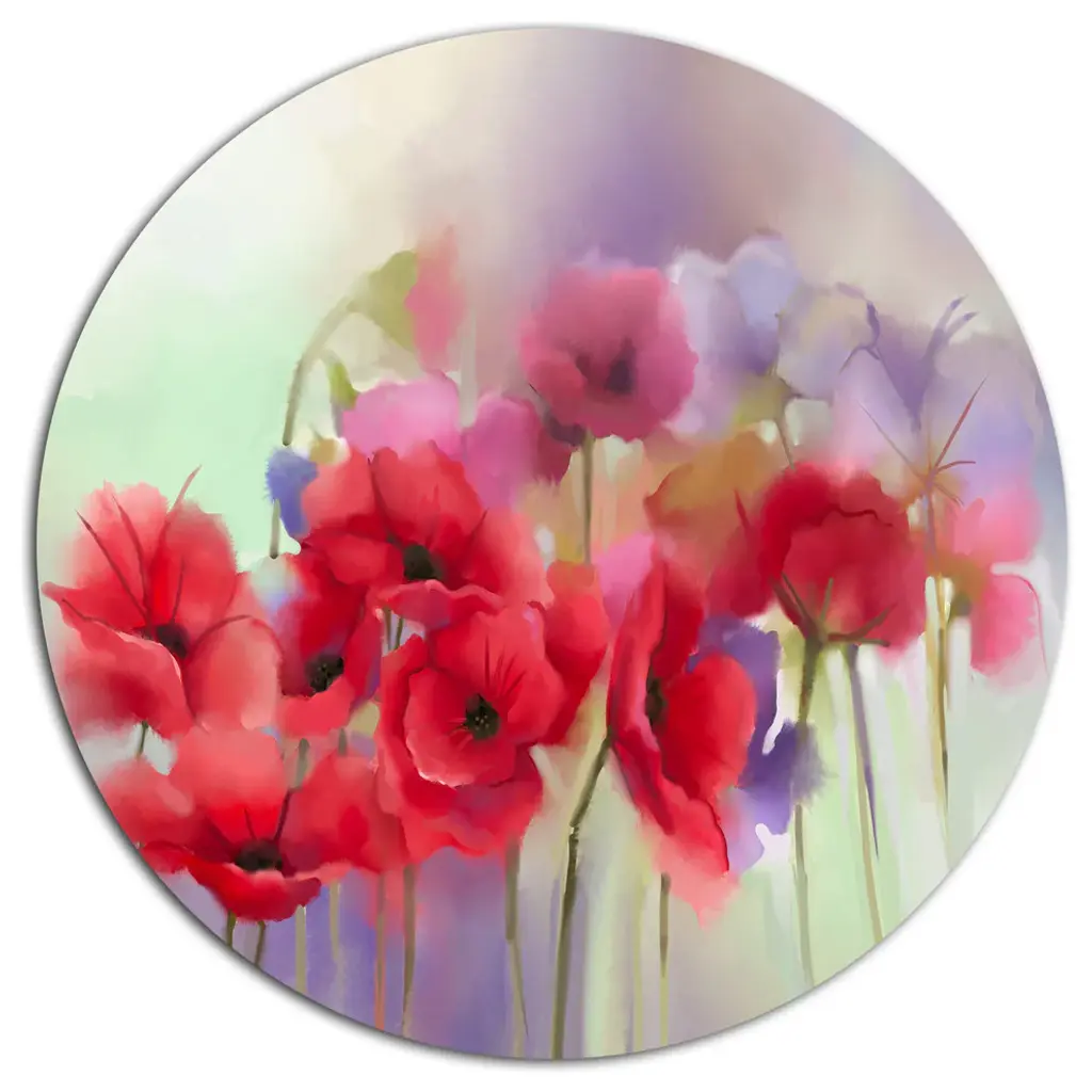 Bring Contemporary Abstraction to your home with this large Circle Metal wall art. This Bouquet of Poppies in Glass Vase Metal Artwork makes it the focal point of any room or office. - White Gloss Coating ensures colors are extra vibrant with light reflection.- Aluminum grade Sheet Metal with 1 inch mounting frame on the back giving the illusion that the artwork is floating on the wall..- Mounting Brackets are included along with instructions.- High Quality Digital images are created directly into a glossy aluminum panel producing a stunning and captivating print into the glossy finish of the metal.- Water, Fire and Scratch resistant HD Aluminum panels.- Looks better than any photo paper and guaranteed to last at least 20 years- Easy to clean with a microfiber cloth. Colors are far superior to regular Canvas Art. - Easy to Hang