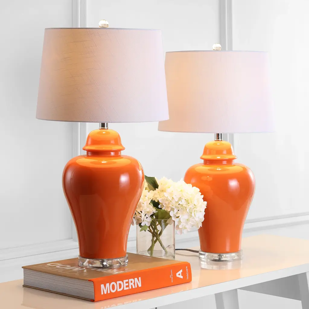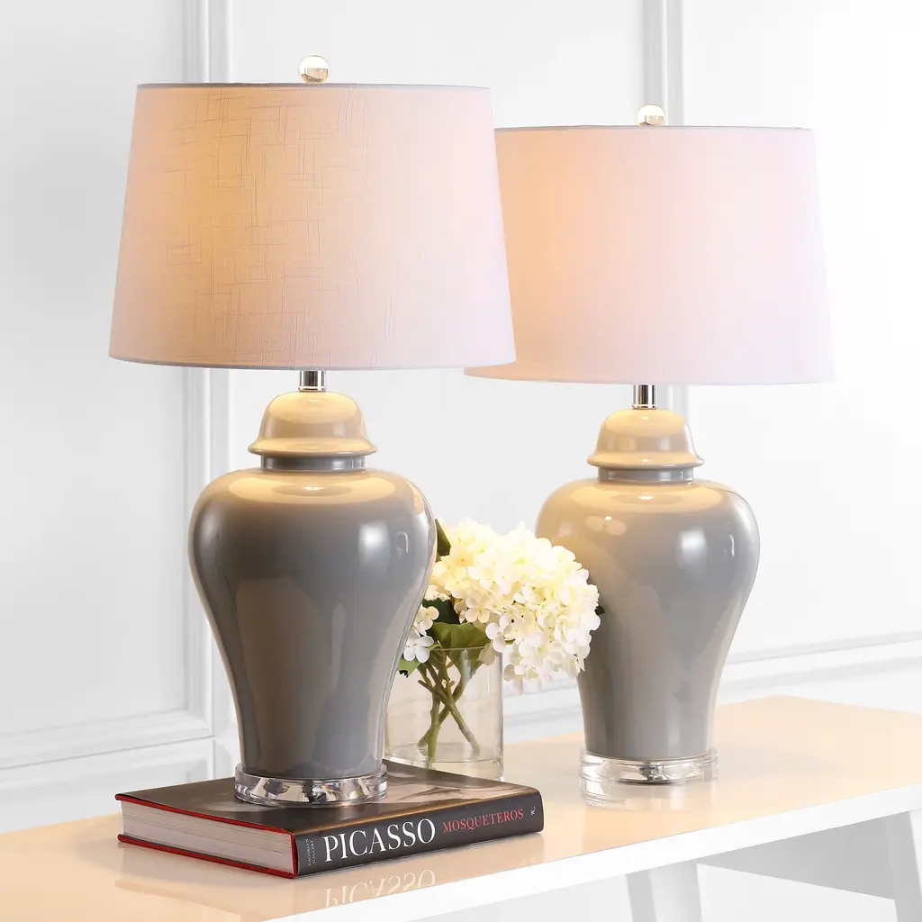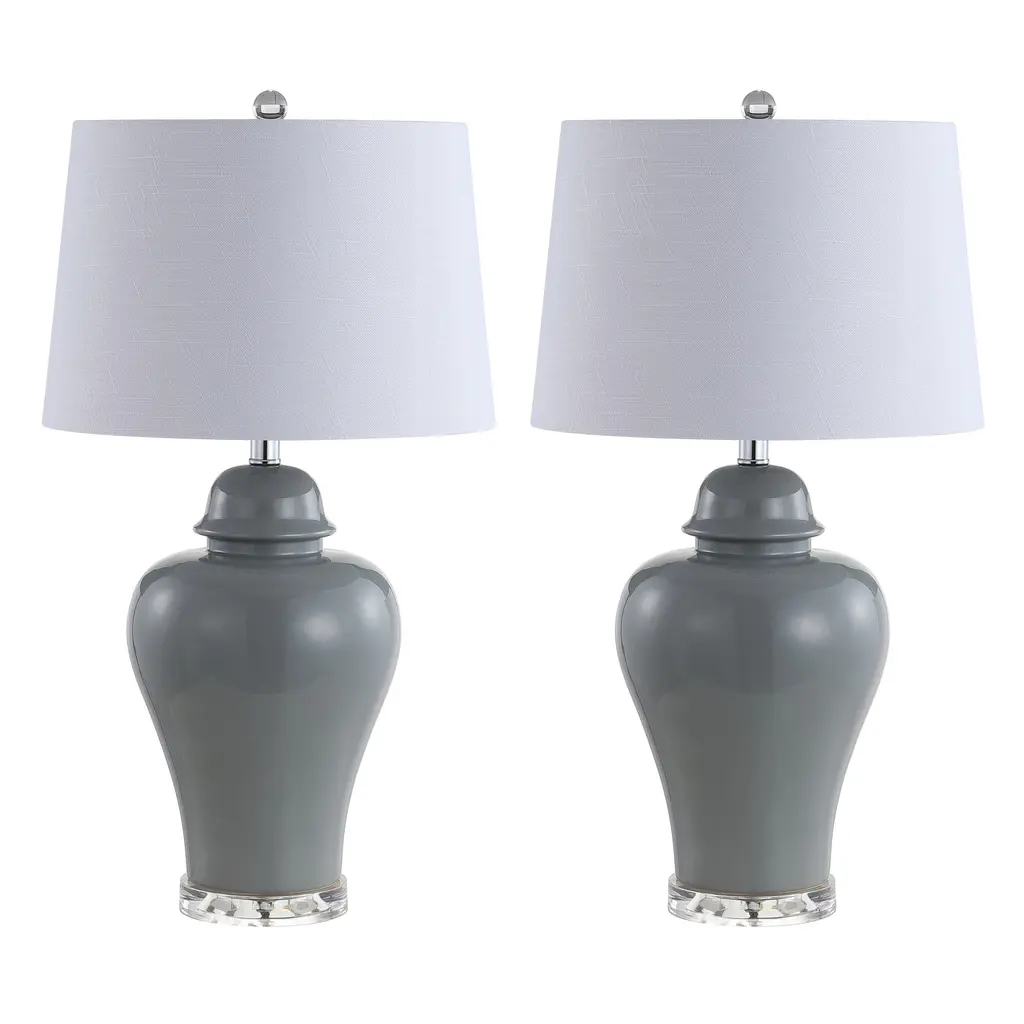 This country-contemporary update of the classic urn table lamp is made of ceramic atop an acrylic base. A soft gray glaze finishes the ceramic, and a crystal finial ties back to the polished acrylic base. Topped with an off-white linen fabric drum shade and finished with a silk-wrapped cord, no detail was overlooked in this classic design. Features:Dimensions:About us:You see a lamp.We see a decorative work of art.A perfectly curved shade casts a dramatic shadow on a floor. A silk cord you never want to hide. LED lightbulbs: as easy on the environment as they are on the eyes. The JONATHAN Y Lighting collection considers every detail from impeccably sourced materials to designer styling. And our prices are so attractive, we've transformed a functional necessity into a fashion accessory.JONATHAN Y Lighting - a fashion revolution in home decor.