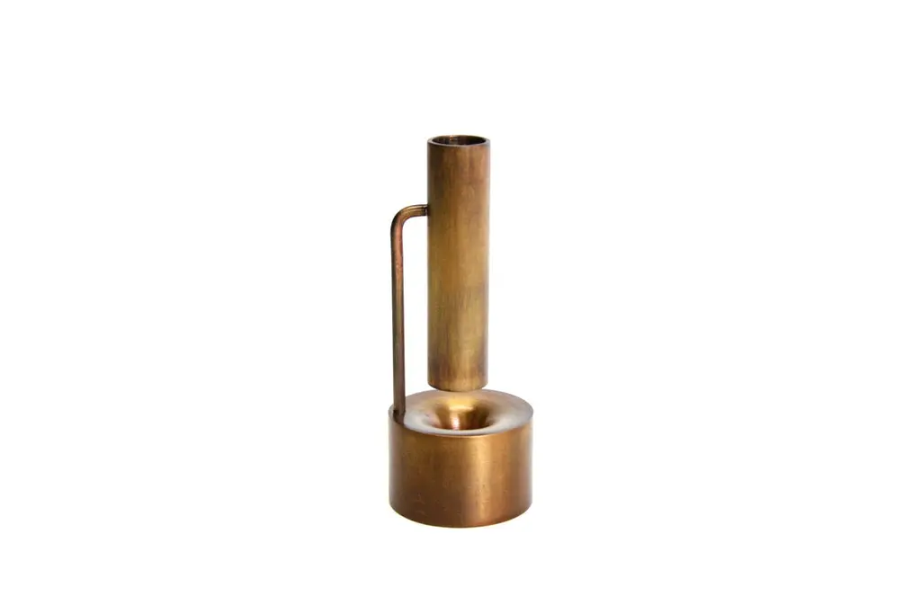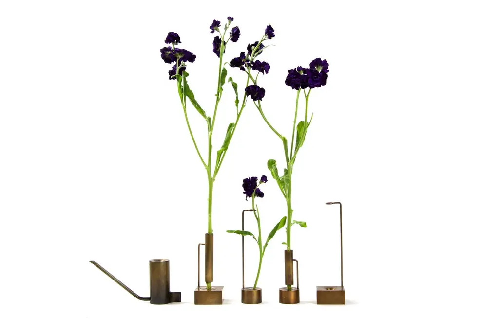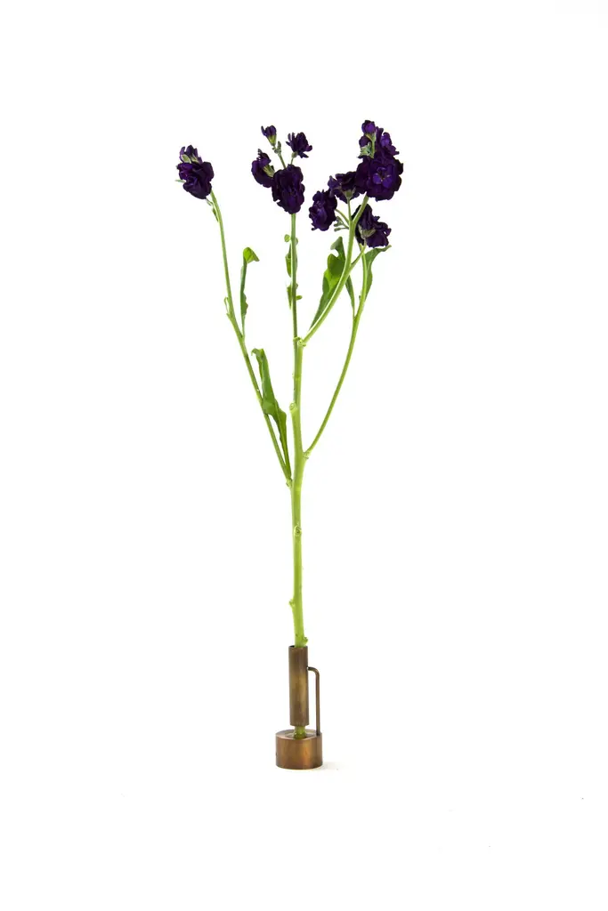Brass bud vase by Gentner DesignDimensions: D 5 x W 5 x H 10 cmMaterials: dull tarnished brassEach of these delicately, handcrafted Bud Vases is perfect as an individual home accessory or whimsical series. Made of brass and hand tarnished, each Bud Vase has its own unique formal language made from the base and stem support. In addition to this whimsical world of bud vases, the miniature Watering Can is perfectly sized to serve the bud vases. Gentner DesignRooted in a language of sculpture, character defining details, and world renowned craftsmanship, the work is found at the crossroads of design and art.Established in 2011, the namesake furniture label is a rare combination of aesthetic dexterity and mastery of craft resulting in furniture and objects that are expressive, formal, and transcend materiality.The collection is based in metal and incorporates only natural materials such as leather, wood, and glass in unique ways, challenging our assumptions.Christopher GentnerChristopher Gentner, with a BFA in metalsmithing from the Cleveland Institute of Art and apprenticeships under sculptors and jewelers, together with dedication to craft, quickly developed his reputation nationally as a foremost authority of metal fabrication and furniture.One of his crowning achievements was the re-creation and fabrication of the Frank Lloyd Wright Robie House gates.These unique experiences are the foundation of his design philosophy which he employs in his own line of furniture, lighting, and objects.