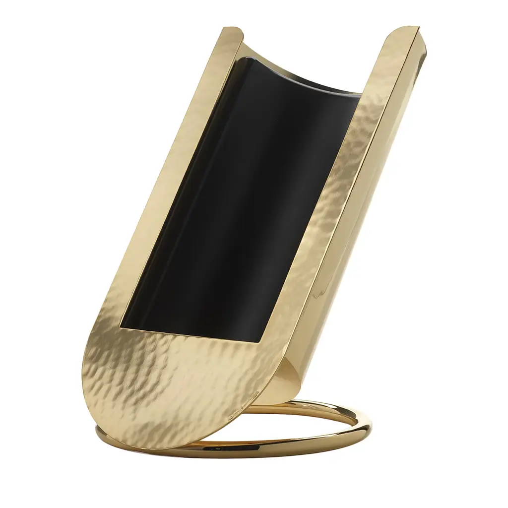 Distinguished for its highly contemporary and elegant design, this handmade vase will be a striking centerpiece on a modern console or minimalist coffee table. Fashioned of nickel-plated brass, this vase takes on a dynamic shape whose smooth contours recall a dorsal fin, catching the eye with its movement. The long sides of the vase are finished with a white varnish that elegantly contrasts with the brass for a striking textural effect. A small opening at the top makes this piece suitable for showcasing tall-stemmed flowers.