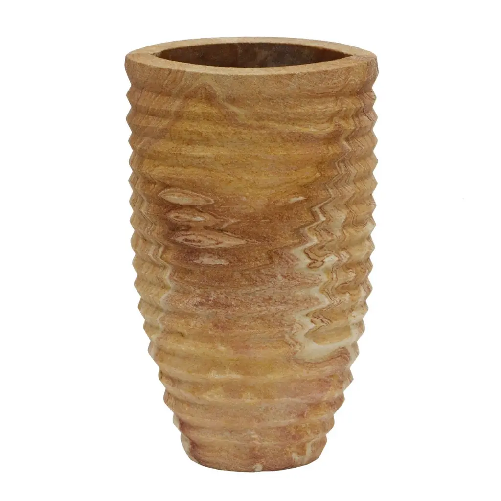 Introducing the Braulia Ribbed Vase, a beautiful and uniquely crafted vase. This natural stone vase is a great addition to your home to add a chic and captivating touch. The ribbed shape with a tapered edge adds artistic decor to your space or serves as an exquisite vase for your floral arrangements.