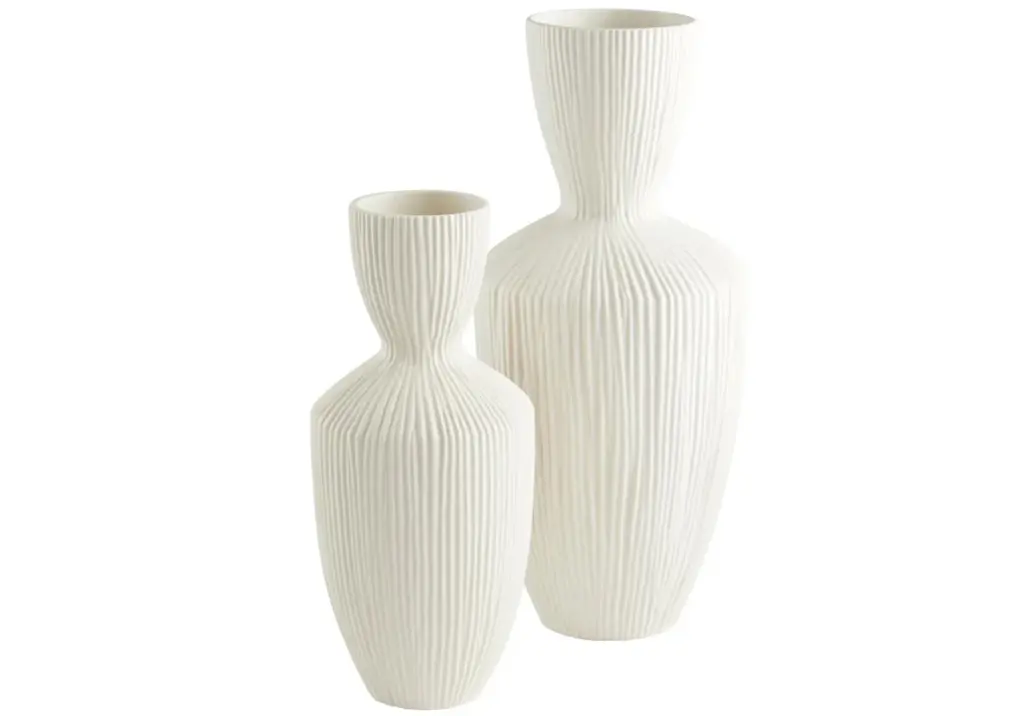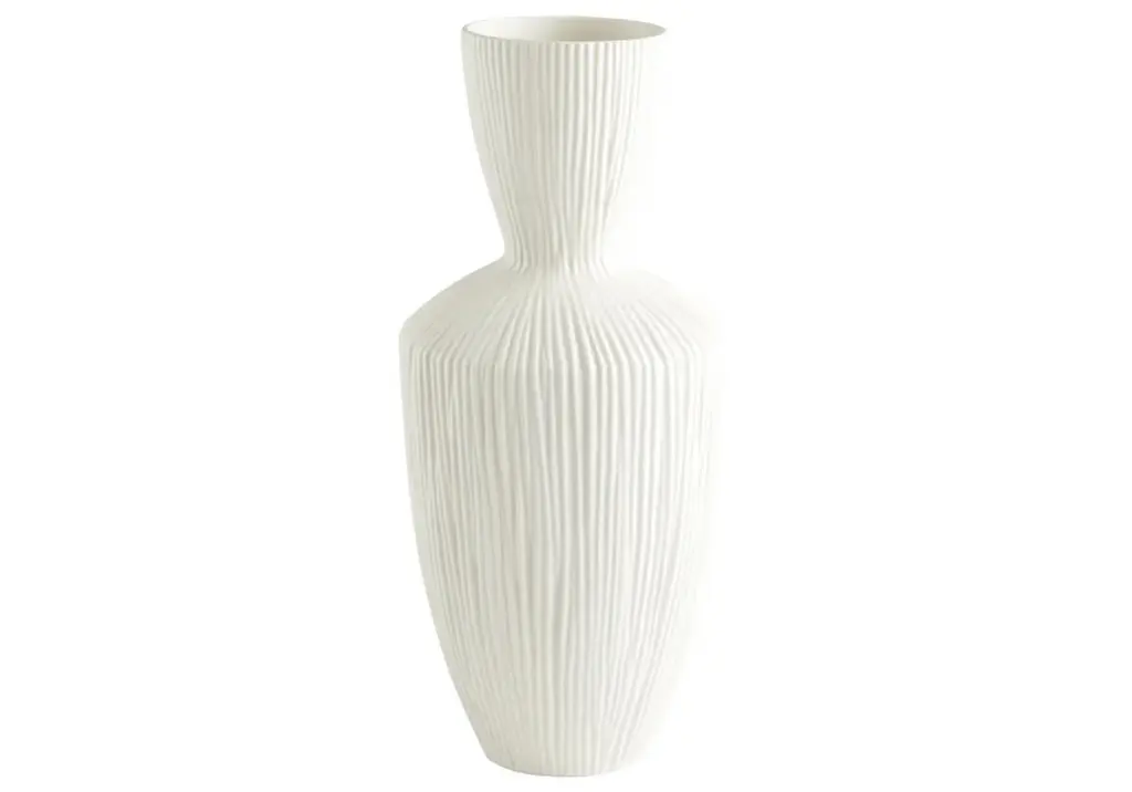 An incredibly textured addition, this vase boasts a tall, shapely form accentuated by linear ridges. Its neutral, white coloring styles well alone or pair with bright florals and greenery for a contrasting, eye-catching design.