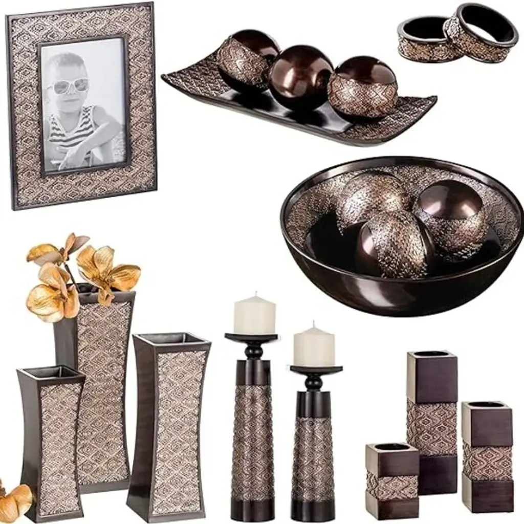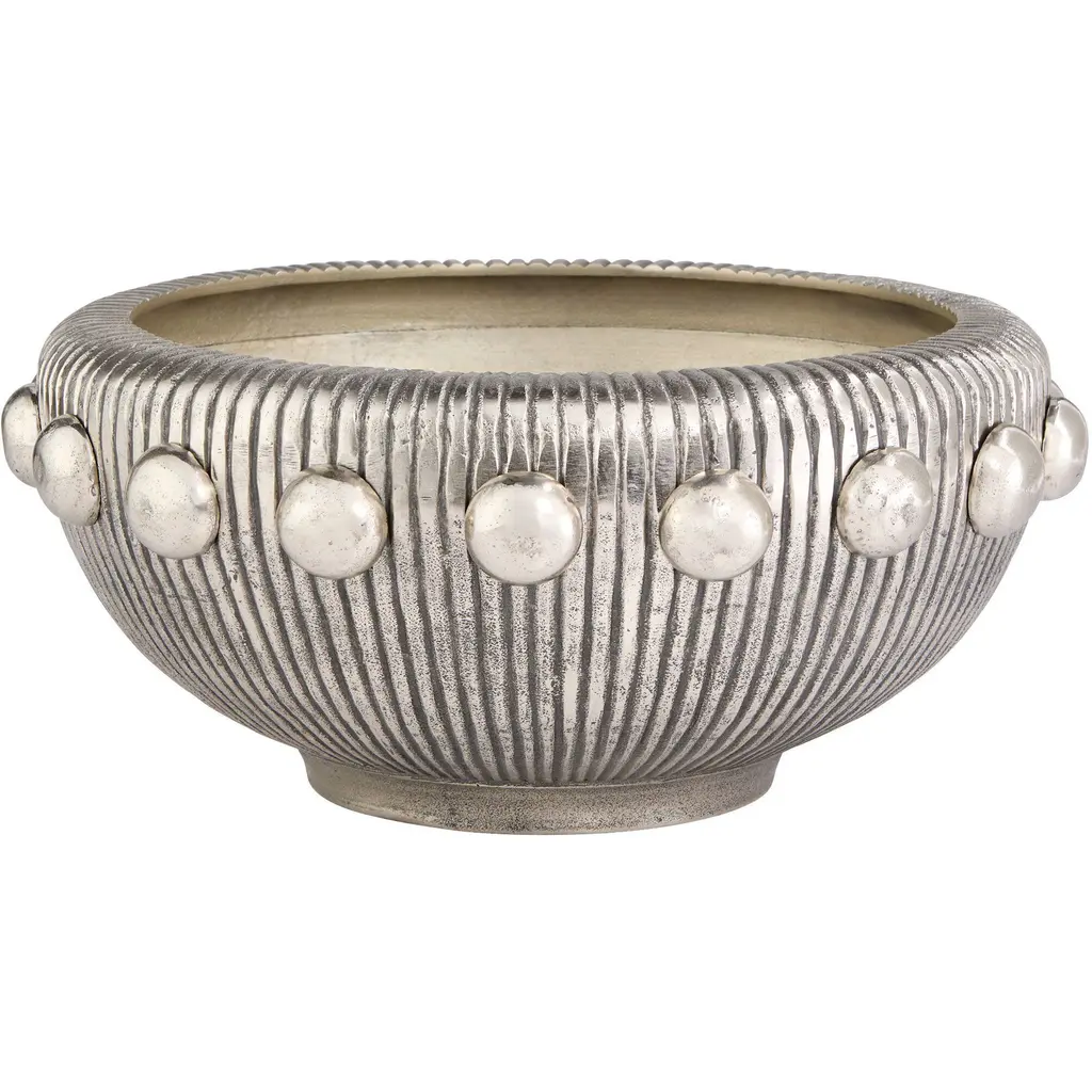 The Brigid Vases are two beautiful home accents, crafted from ceramic with a Bronzed tone, showcasing a spherical silhouette. Lively floral motifs in a Silver Champagne finish adorn the rim, elevating the design with depth and dimension.