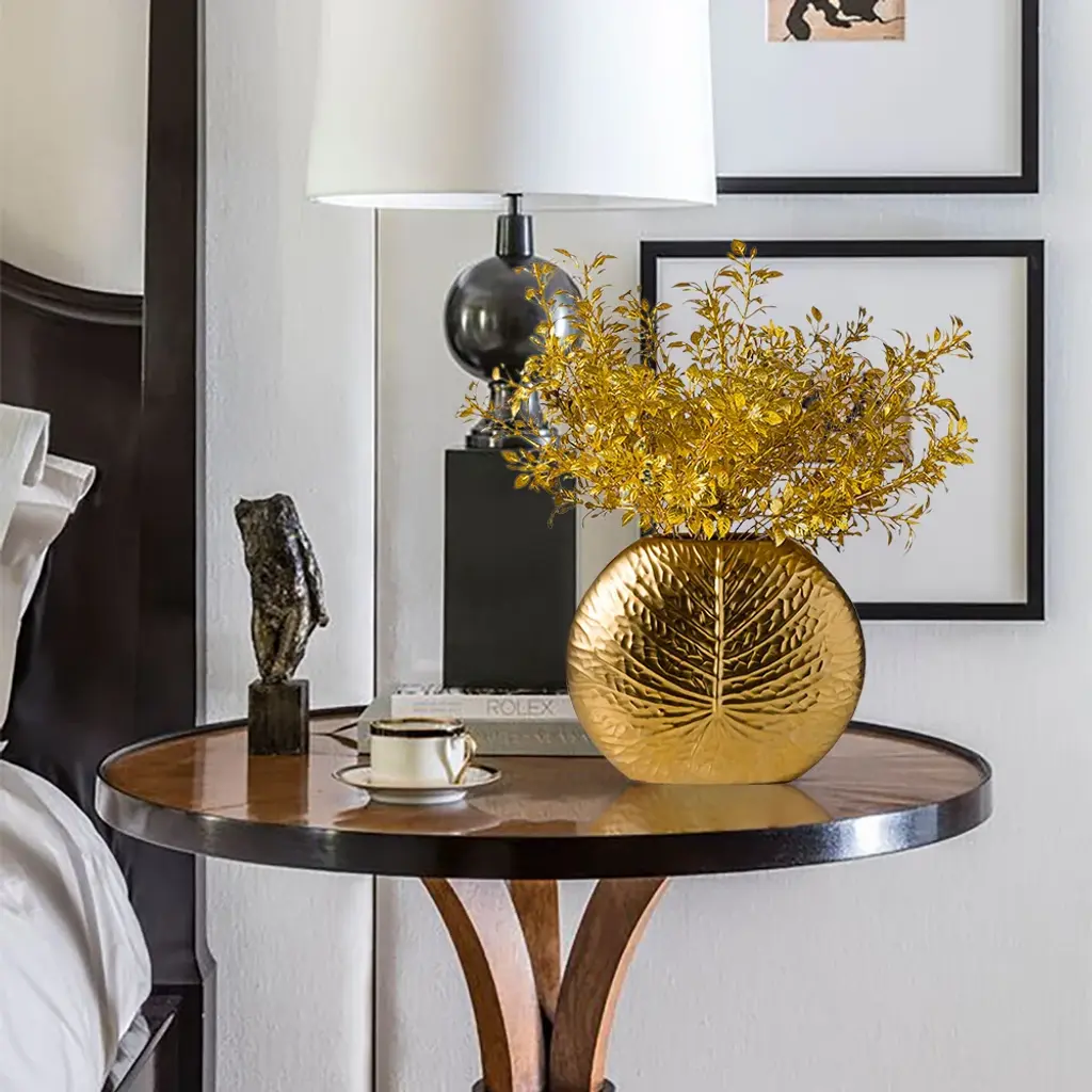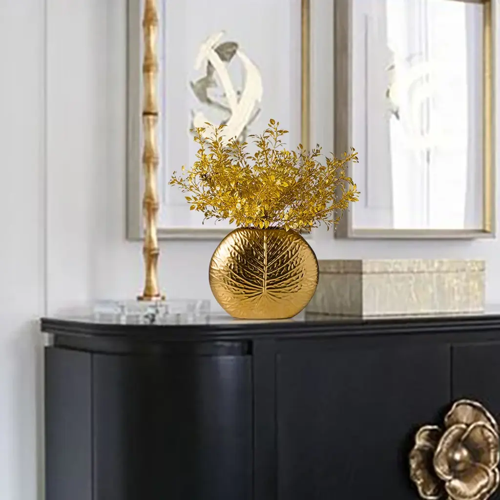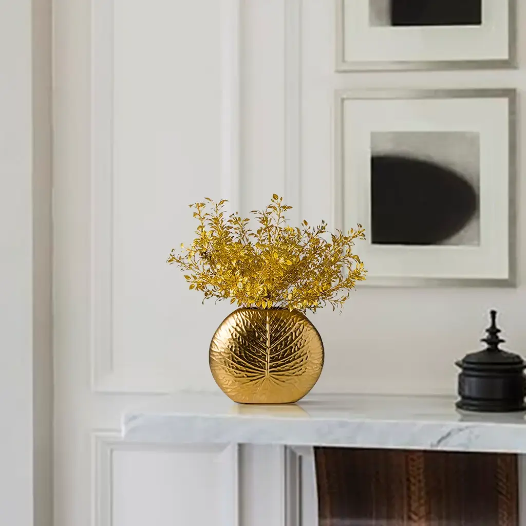 Raise the level in your home decor with this bundle of bronze gold luxury artificial plants from us. This bouquet is handmade and really turns heads, thanks to its fancifully textured gold-finished ceramic vase, which brightens up any room. Perfect decoration for any living room, bedroom, dining room, or office.