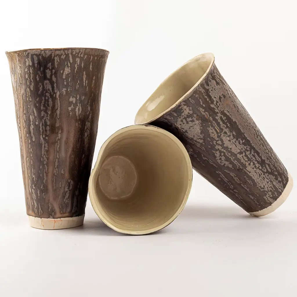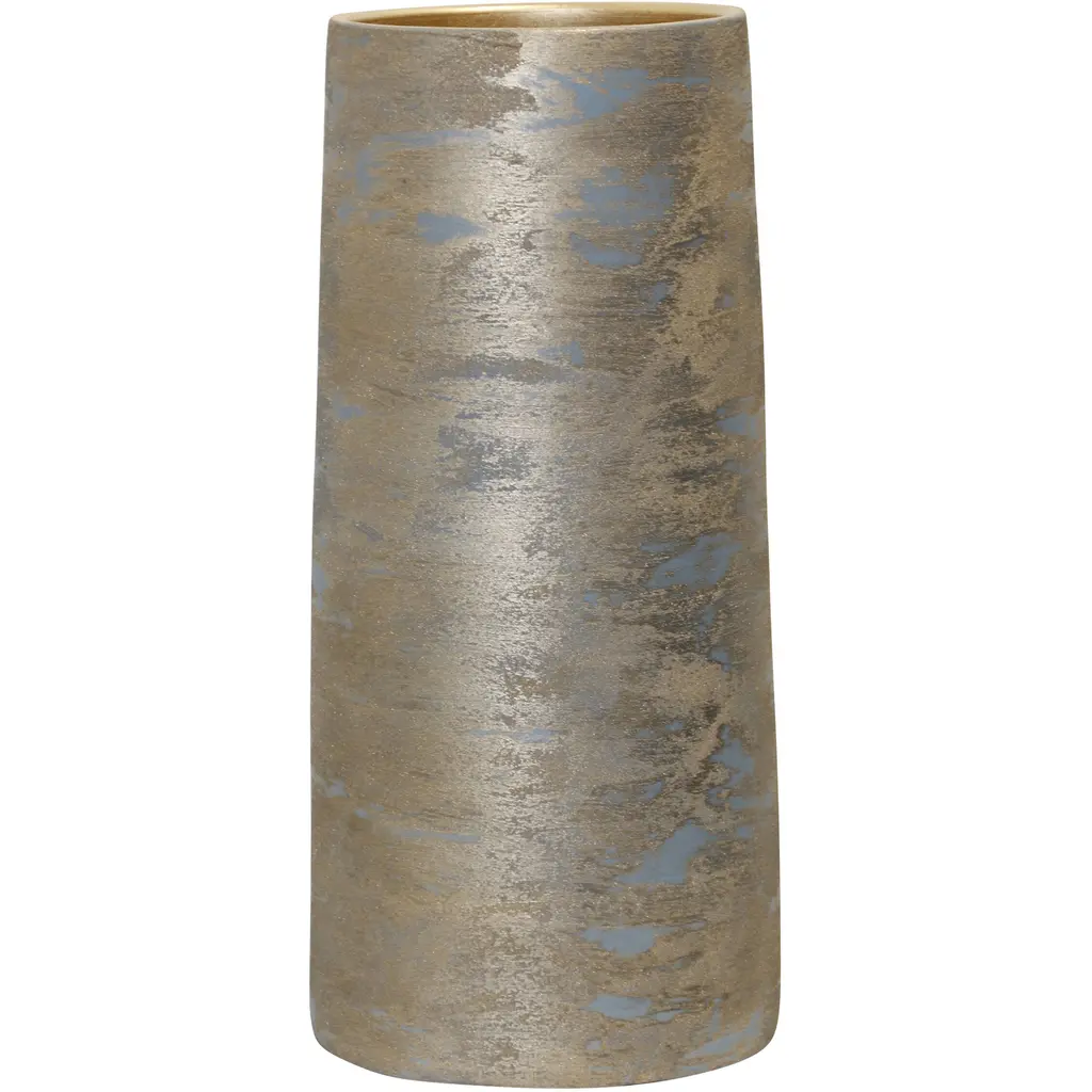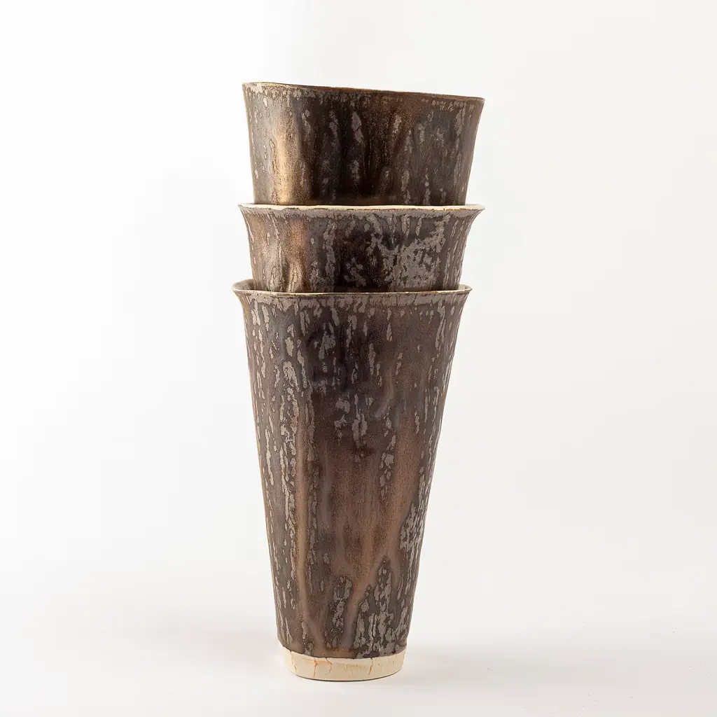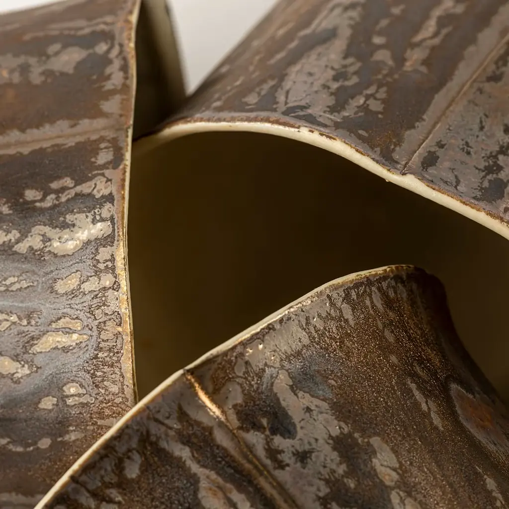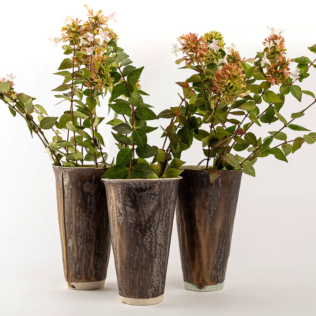Porcelain flower vase characterized by different glazes: satin transparent inside and bronze-colored outside with metallic effects. The technique used is slip casting in cardboard molds. The bronze-colored glaze develops slightly different effects on each piece. Each piece is unique, and due to handcrafting, slight changes may occur.
