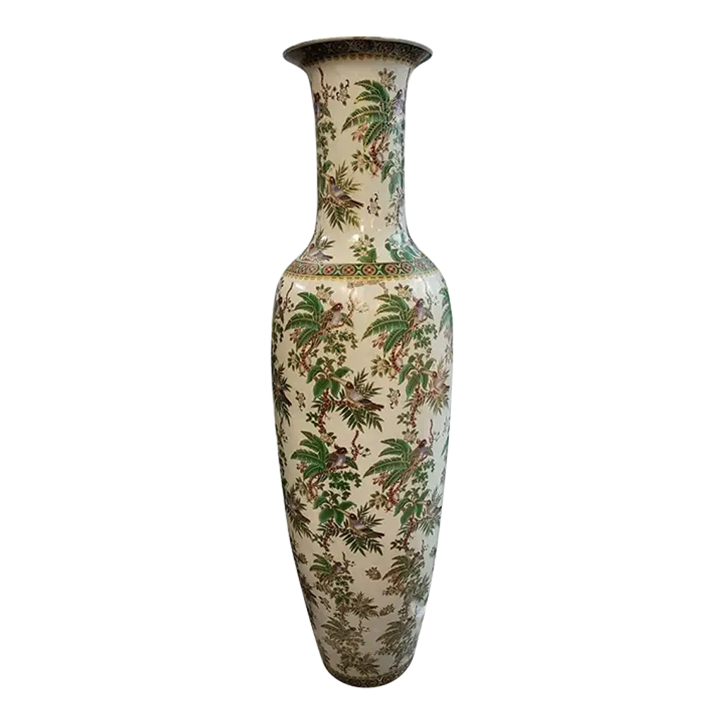 Green Glaze On Ceramic With Hand Painted Floral And Birds