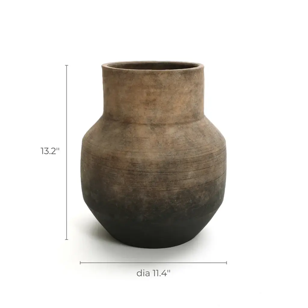 This 100% handcrafted terracotta vase, inspired by the classic milk can shape, showcases natural beauty and high-quality, unique design. Each vase is meticulously crafted by artisans, featuring a distinctive color gradient that transitions from black at the base to a warm brown at the top, creating a unique vintage aesthetic. Influenced by retro and antique styles, this vase exudes old-world charm. It is the perfect decorative piece for dining tables, desktops, consoles, countertops, or shelves, enhancing the decor of any space. Measuring 11.4 inches in height, this vase is the ideal size for various settings.