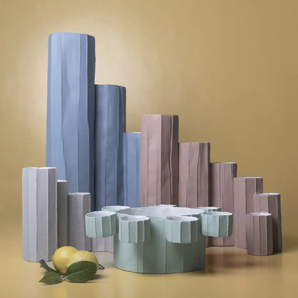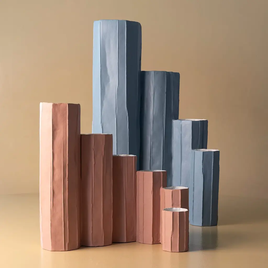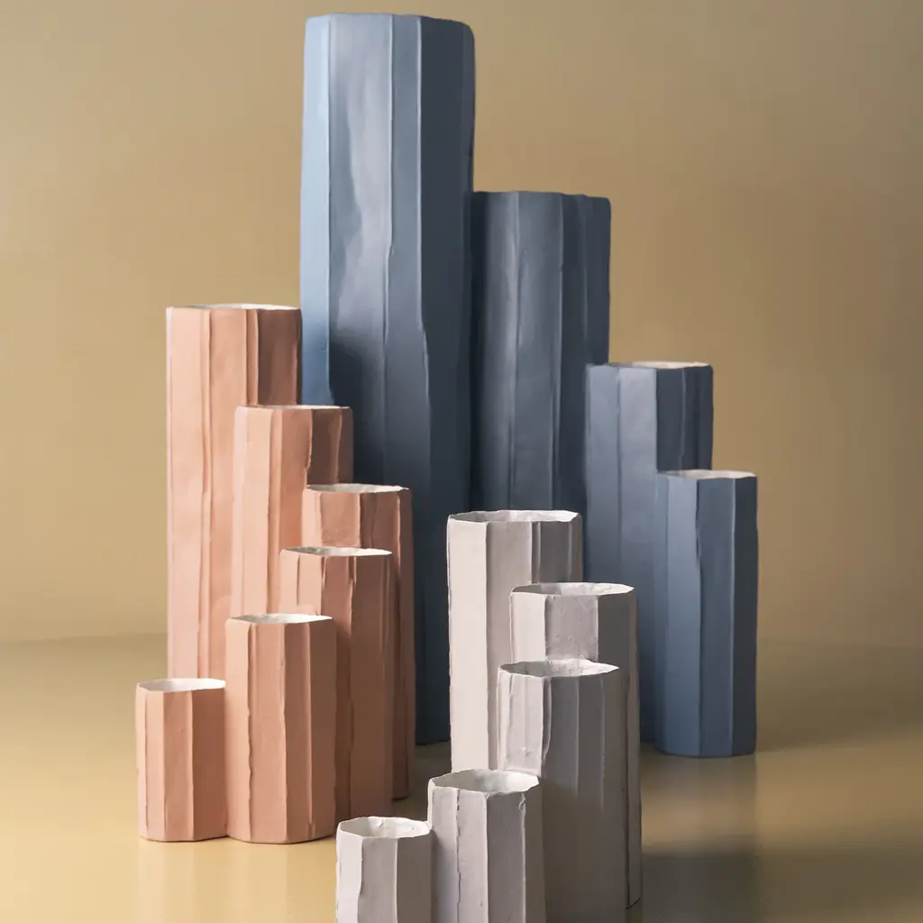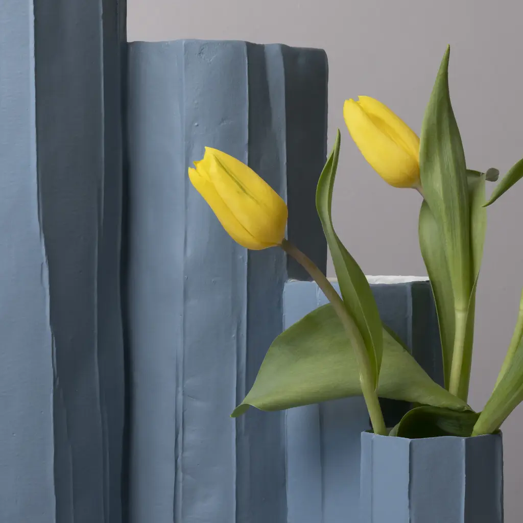 The Bruco vase in blue ceramic is a striking piece inspired by the organic forms found in nature. Its dynamic design features varying heights and diameters, evoking movement and fluidity. The shape suggests imagery like clustered tree trunks or the silhouette of a city skyline, bringing contemporary elegance to any space. This vase is perfect for bold floral arrangements or as a standalone statement piece. The interplay of textures and hues adds depth, inviting admiration from every angle. With its whimsical interpretation, the Bruco vase offers a captivating addition to any home décor.