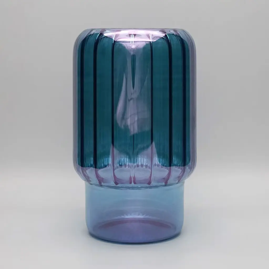 A stunning design deftly handmade by expert artisans of the Venetian glassmaking tradition, this spectacular vase is distinguished by a blueish, purple shade spread by hand with a brush. Perfect to complete with a bouquet of colorful flowers or a single rose, it features an eccentric silhouette with a rounded body and a tapered base.