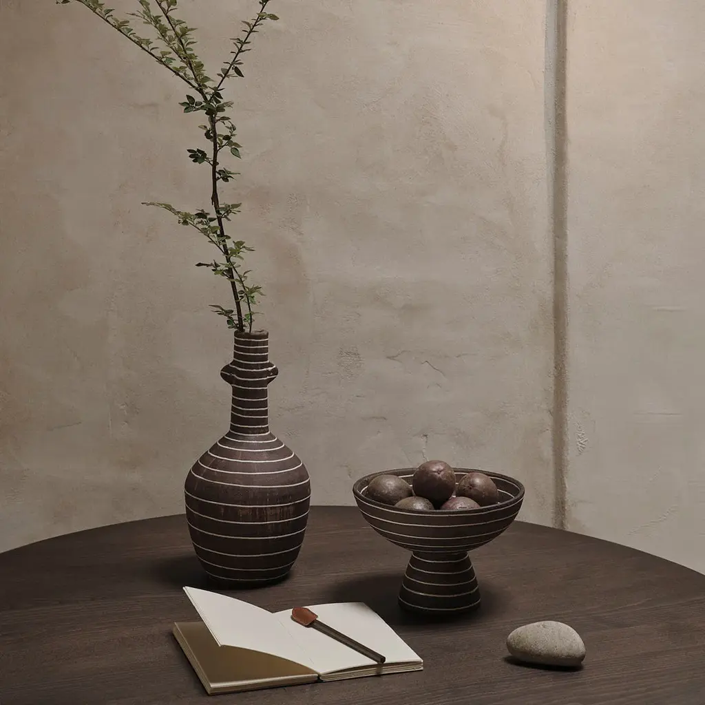 The Brura Vase is defined by its elongated neck and sleek body, adorned with bold white stripes that gracefully snake around its form. Crafted from terracotta, the piece exudes rustic elegance, enhanced by a coffee-colored glaze that lends a sense of depth and richness. Hand-painted stripes accentuate the vase’s contours, while miniature ears on either side add whimsical personality and charm to this distinctive piece. Style it with stalks of fresh flowers or dried branches, or let it stand alone as a striking decorative element. Variation in the finish may occur due to the glaze type.
