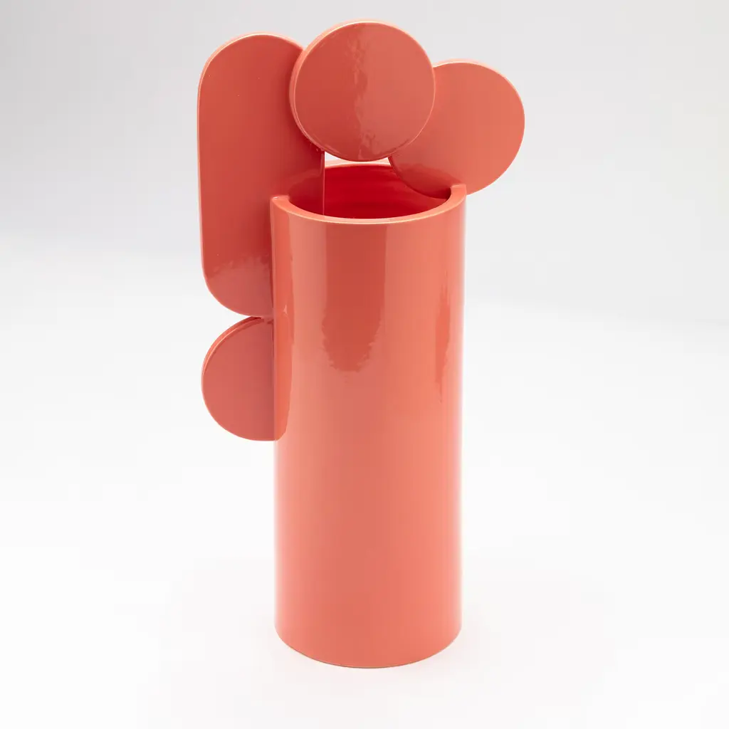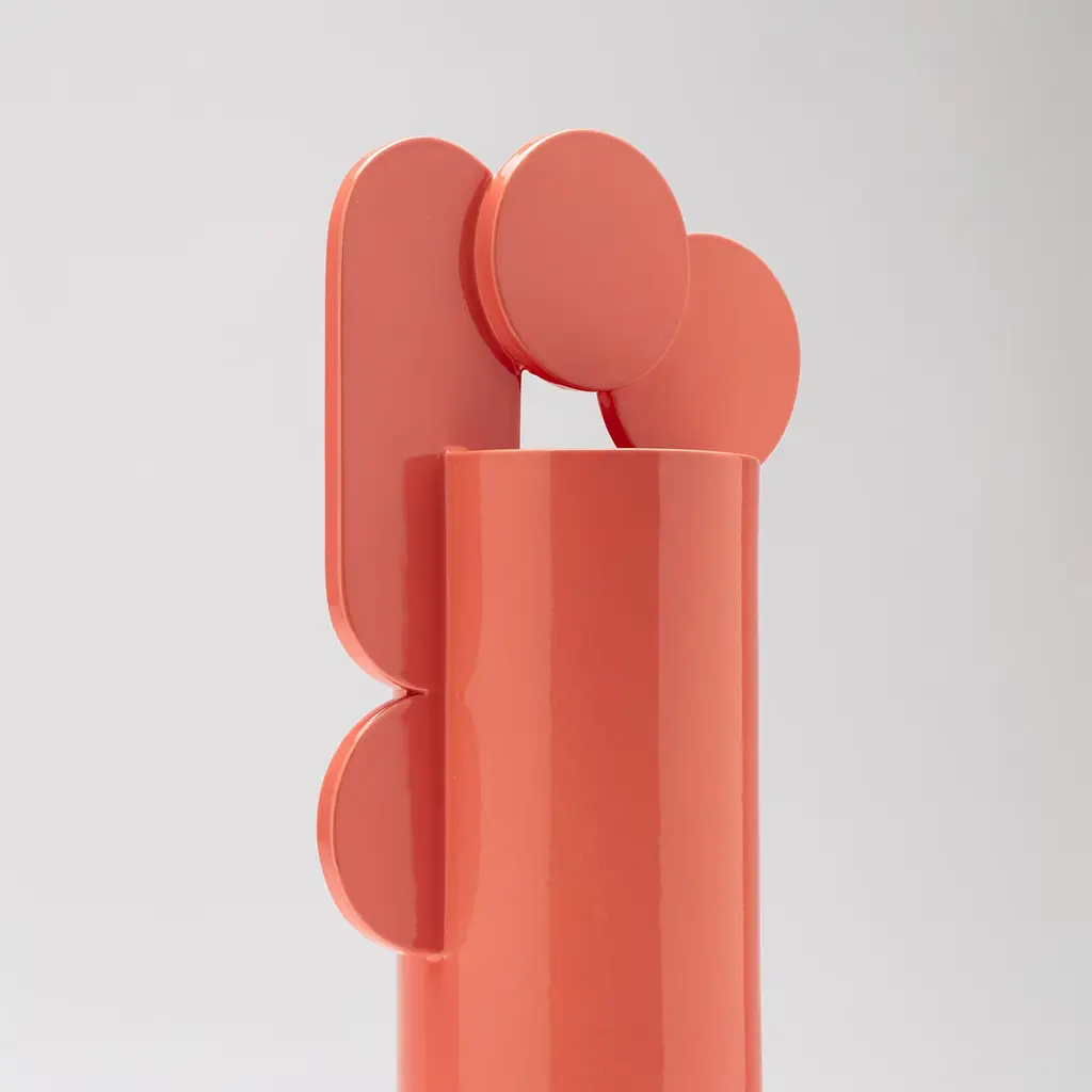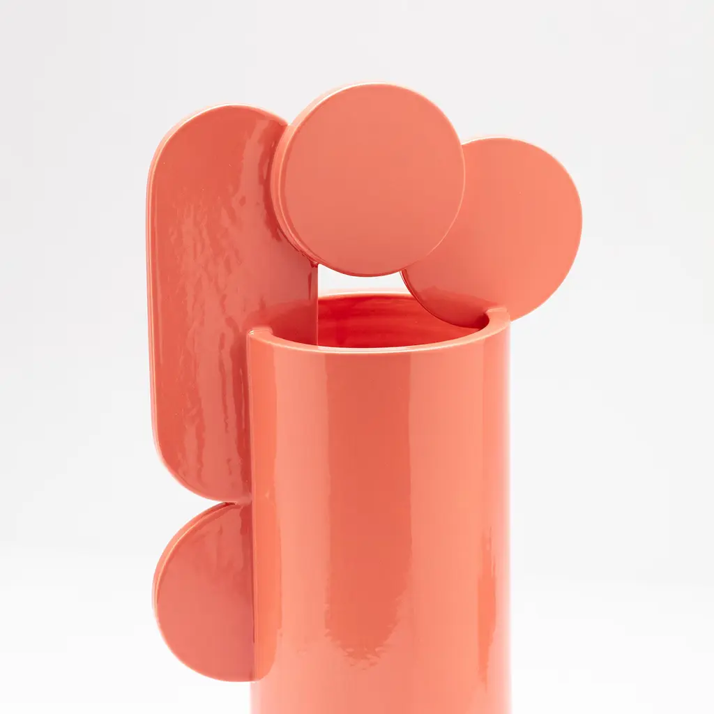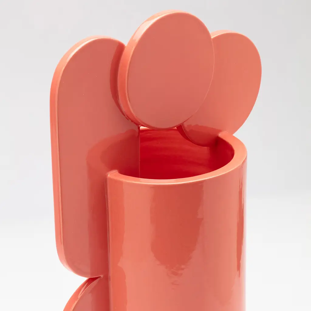 A vibrant shade of pastel orange immediately reveals the sense of liveliness this precious ceramic vase exudes. Its bubbly character results reinforced by the dynamic geometric-inspired composition vaguely reminiscent of a couple of lovers, a choice underlining the vase's distinctive decorative flair. Not suitable to hold liquids. The vase is delivered with an authenticity certificate.