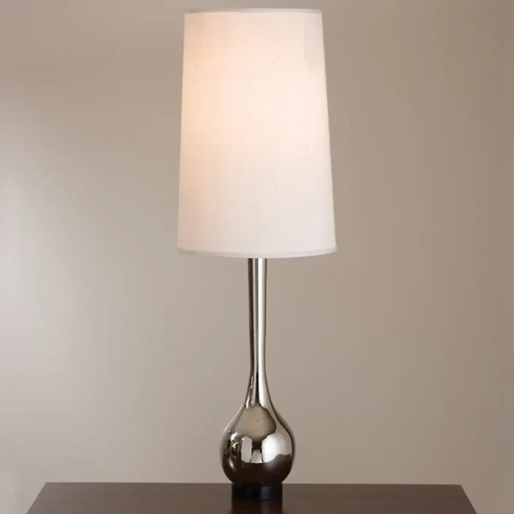 A vernal vessel of light, the Global Views Bulb Vase Table Lamp is as fresh as the flowers that were replaced by a crisp lampshade. The cylindrical shade is decoratively adorned with a faux silk trim while the sensual base is available in a vintage Antique Brass finish or a clean and contemporary Nickel. An on/off switch is located at the socket.