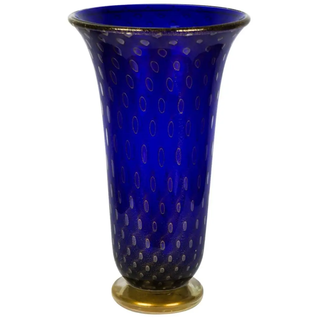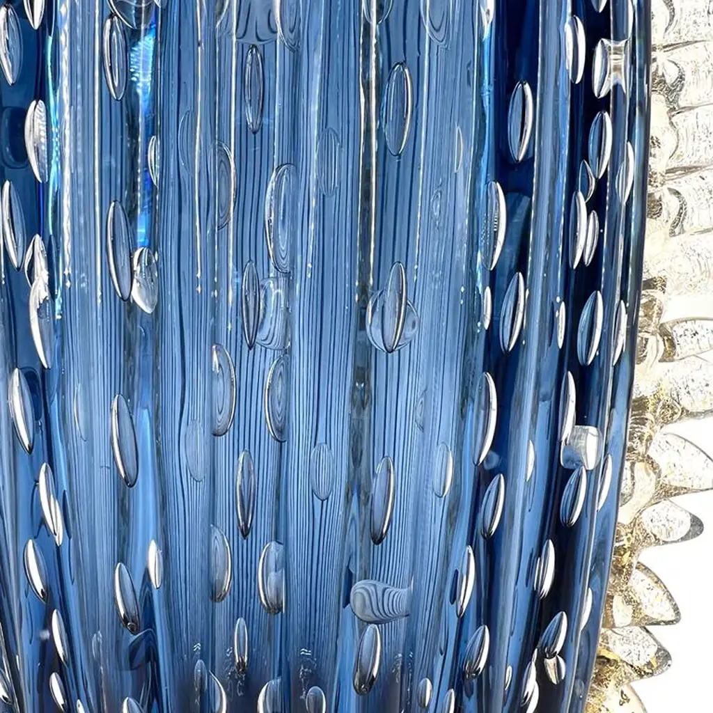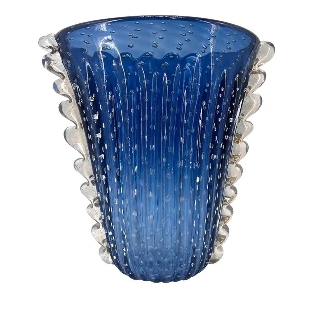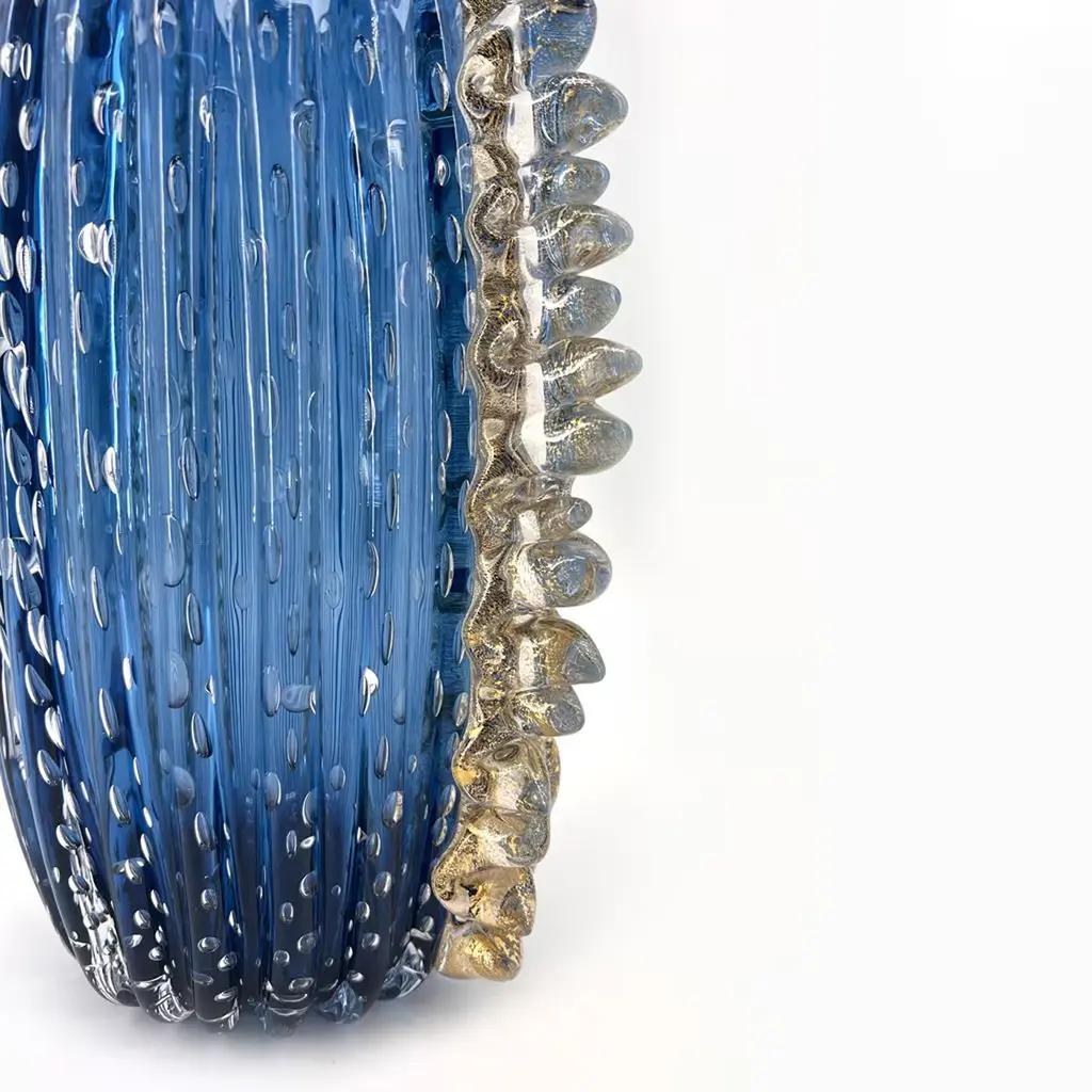 Eccentricity and freshness characterize this one-of-a-kind Murano glass vase, which owes its uniqueness to a precious manual crafting process. Featuring indented clear glass filaments enriched with 24K gold specks applied thanks to the "incalmo" method, the vase boasts a flounced navy-blue body embellished with air bubbles trapped within, obtained by following the ancient submerged "balloton" technique.
