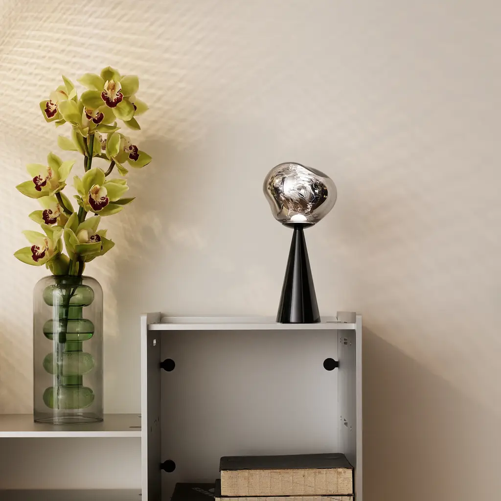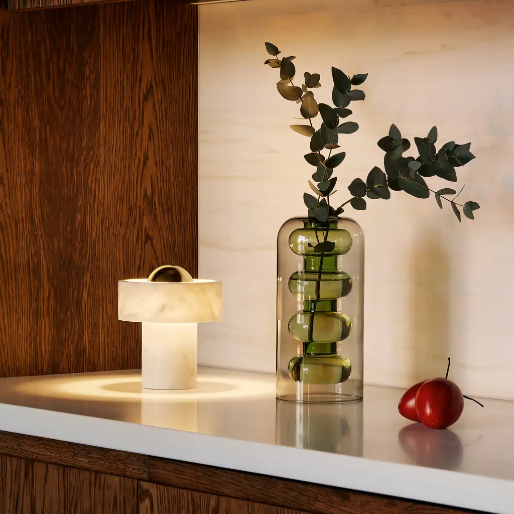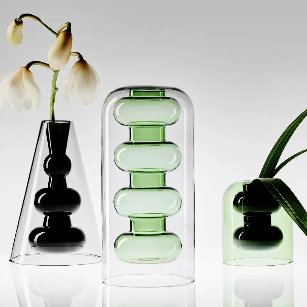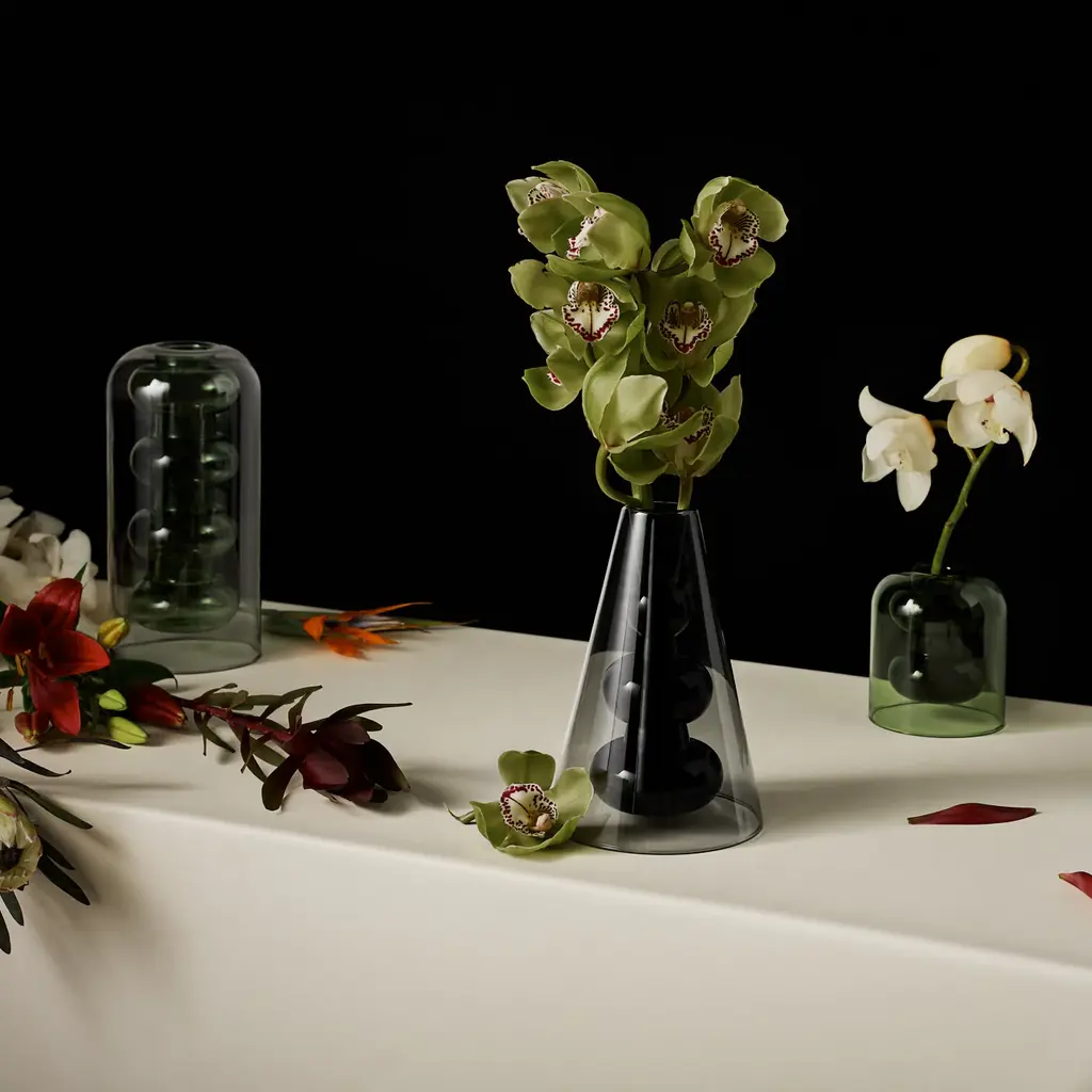The transformative alchemical processes of tea making, mixology and floral arrangements play into the form of the Bump Collection from Tom Dixon, hand blown from borosilicate glass. The British designer considers the doubled-wall vessels with their often curious shapes used in the laboratory, as well as the play in transparency and translucence. The effect is particularly bewitching with this trio of vases.