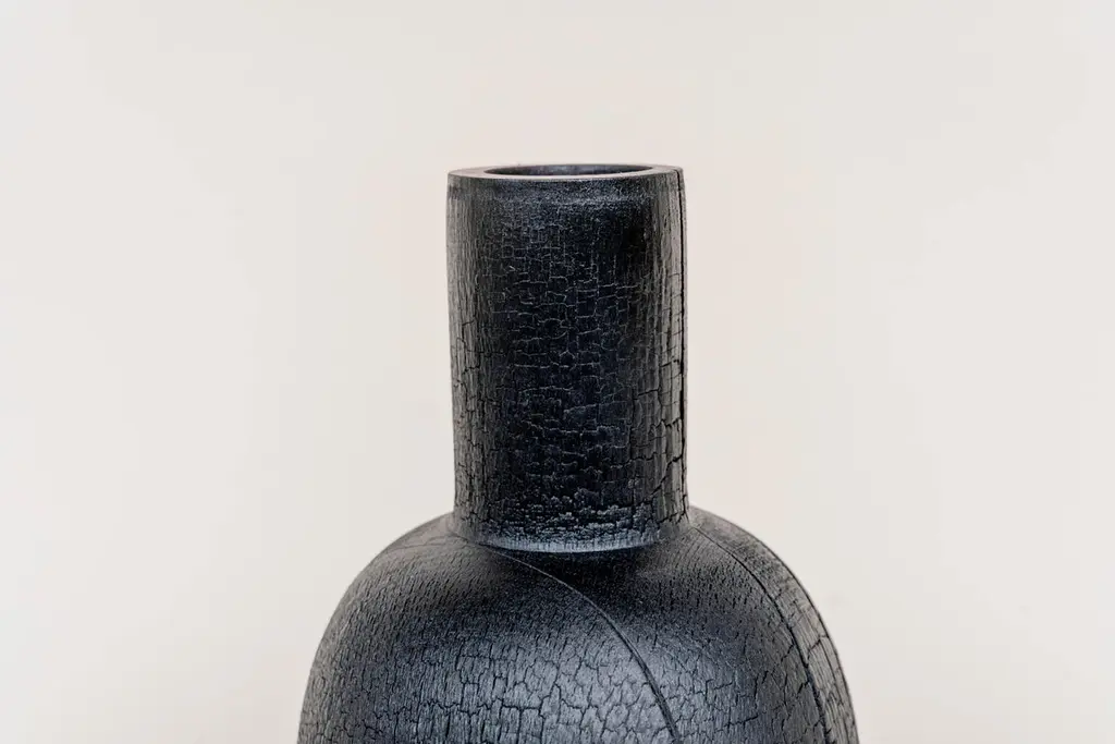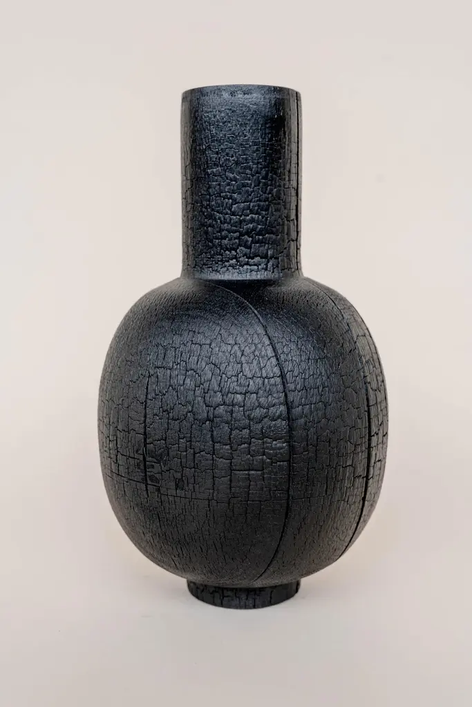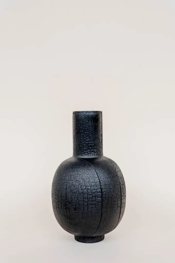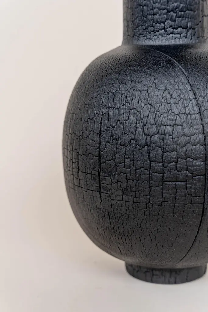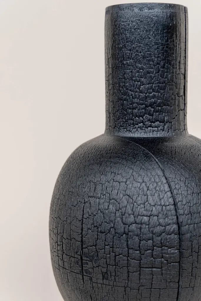 Burnt vase XL #4 by Daniel ElkayamOne of a KindDimensions: D 15 x W 15 x H 45 cm Materials: Burnt beech woodJerusalem-born Art-designer and Photographer based in Tel-Aviv. Operating in the field of sustainable home decor and specializing in conceptual design, material exploring, and story-telling through objects. Graduated in 2019 his Bachelor's studies at the Industrial design department at Bezalel Academy of Arts and Design, Jerusalem. A former member of the Bezalel Alumni Design Incubator 2020. Won the excellent scholarship of America-Israel cultural foundation of 2019 Inspired by nature and its phenomenons, the artist transforms natural materials and aesthetics into one-of-a-kind unique objects. In his works, Daniel implements his curiosity and yearning for unrefined aesthetics, and by material transformation and unique techniques he is developing in his studio, he shows how unattractive materials can be not only valid but luxurious. Elkayam examines the range between art and design by taking things in and out of their context, creating hybrids between different worlds of content, intervening in natural processes, while leaving a gap for the unexpected, the unknown. He expresses his inner world and illustrates his ideas by creating objects and experiences. Through his perspective of materiality, and empathetic vision of his surroundings, he developed an intuitive way of creation with experimental materials such as algae, corrosion, charcoal, and more. Every collection of objects expresses different material research and follows curious narratives and a variety of topics such as locality, transience, and decay of materials. THE CHARRED COLLECTION: A collection of handmade wooden objects inspired by one of the most powerful natural phenomena in our world, which is out of control. Today the percentage of fires caused by natural causes is significantly lower than those caused by humans. The huge fires quickly deplete the forests, leaving behind a particularly surrealistic view of a burnt, black piece of nature. Out of interest in this show was created the desire to preserve the unique aesthetics of the burnt wood and to express in objects the feelings and questions it raises as a raw material in itself. The same scorched aesthetic combined with everyday objects, on the one hand, serves as a mirror for the consequences of the situation we have created and as a means of dealing with its ecological results, and on the other hand, as a visual echo of fire intensity and aesthetic effects.