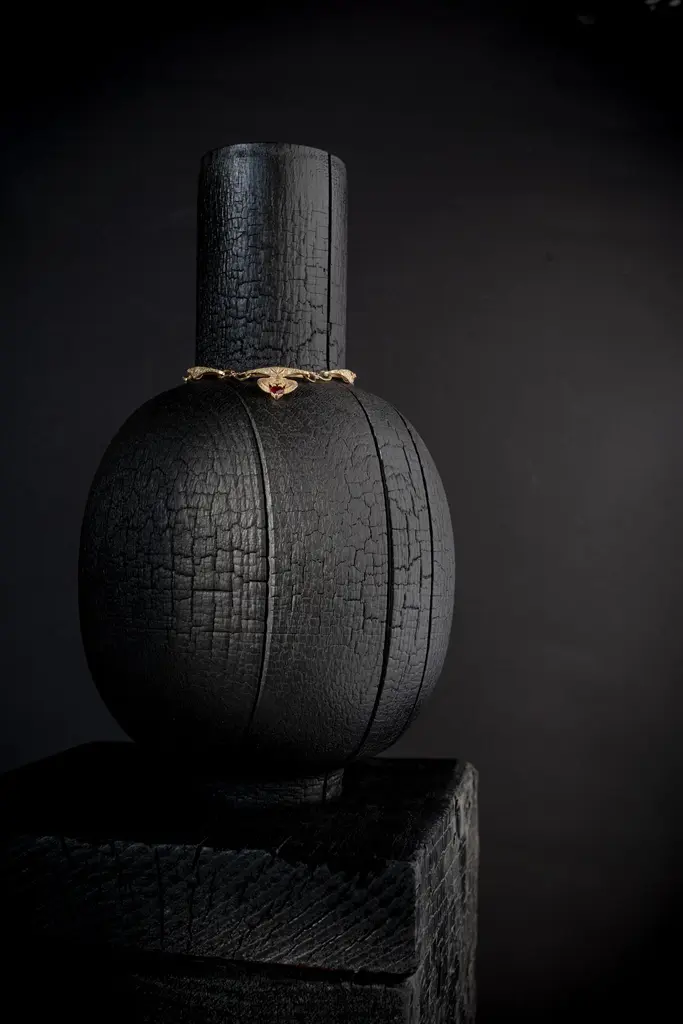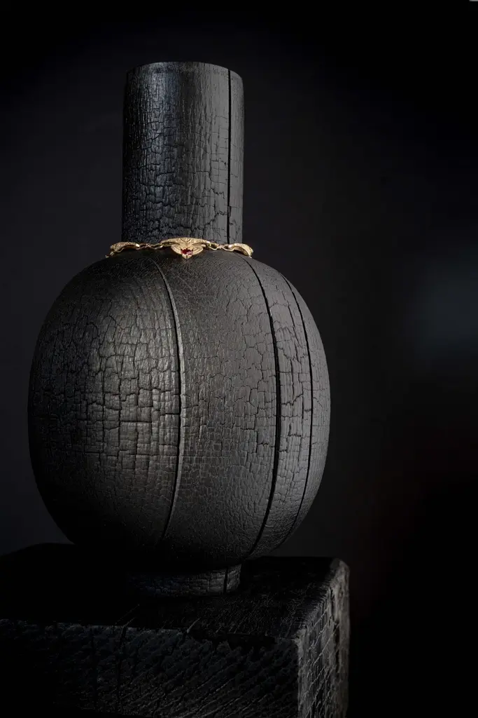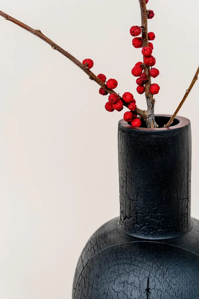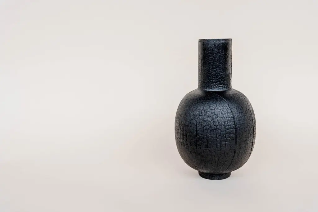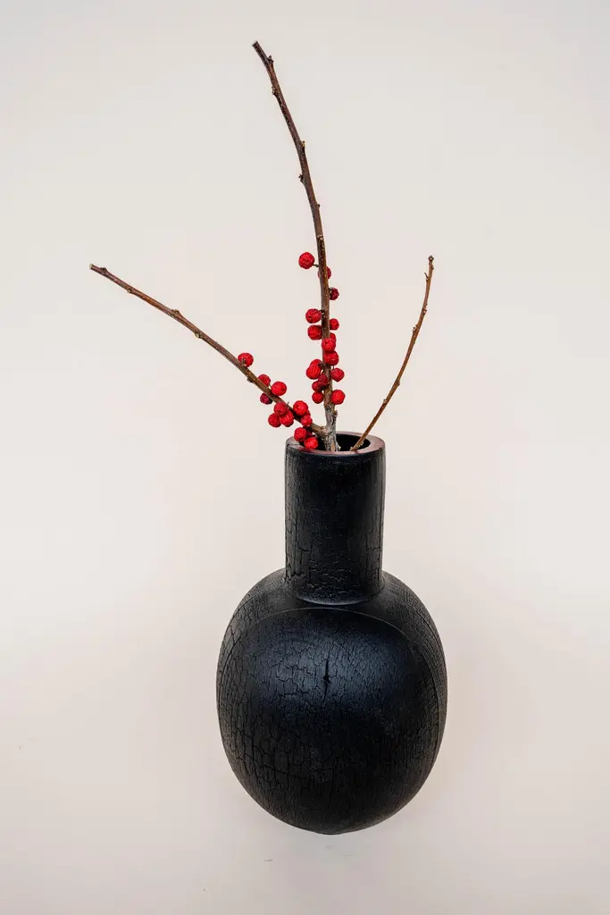 Burnt vase XL #4 by Daniel ElkayamOne of a KindDimensions: D 15 x W 15 x H 45 cm Materials: Burnt beech woodJerusalem-born Art-designer and Photographer based in Tel-Aviv. Operating in the field of sustainable home decor and specializing in conceptual design, material exploring, and story-telling through objects. Graduated in 2019 his Bachelor's studies at the Industrial design department at Bezalel Academy of Arts and Design, Jerusalem. A former member of the Bezalel Alumni Design Incubator 2020. Won the excellent scholarship of America-Israel cultural foundation of 2019 Inspired by nature and its phenomenons, the artist transforms natural materials and aesthetics into one-of-a-kind unique objects. In his works, Daniel implements his curiosity and yearning for unrefined aesthetics, and by material transformation and unique techniques he is developing in his studio, he shows how unattractive materials can be not only valid but luxurious. Elkayam examines the range between art and design by taking things in and out of their context, creating hybrids between different worlds of content, intervening in natural processes, while leaving a gap for the unexpected, the unknown. He expresses his inner world and illustrates his ideas by creating objects and experiences. Through his perspective of materiality, and empathetic vision of his surroundings, he developed an intuitive way of creation with experimental materials such as algae, corrosion, charcoal, and more. Every collection of objects expresses different material research and follows curious narratives and a variety of topics such as locality, transience, and decay of materials. THE CHARRED COLLECTION: A collection of handmade wooden objects inspired by one of the most powerful natural phenomena in our world, which is out of control. Today the percentage of fires caused by natural causes is significantly lower than those caused by humans. The huge fires quickly deplete the forests, leaving behind a particularly surrealistic view of a burnt, black piece of nature. Out of interest in this show was created the desire to preserve the unique aesthetics of the burnt wood and to express in objects the feelings and questions it raises as a raw material in itself. The same scorched aesthetic combined with everyday objects, on the one hand, serves as a mirror for the consequences of the situation we have created and as a means of dealing with its ecological results, and on the other hand, as a visual echo of fire intensity and aesthetic effects.