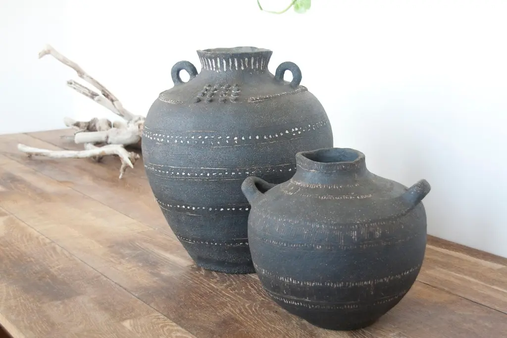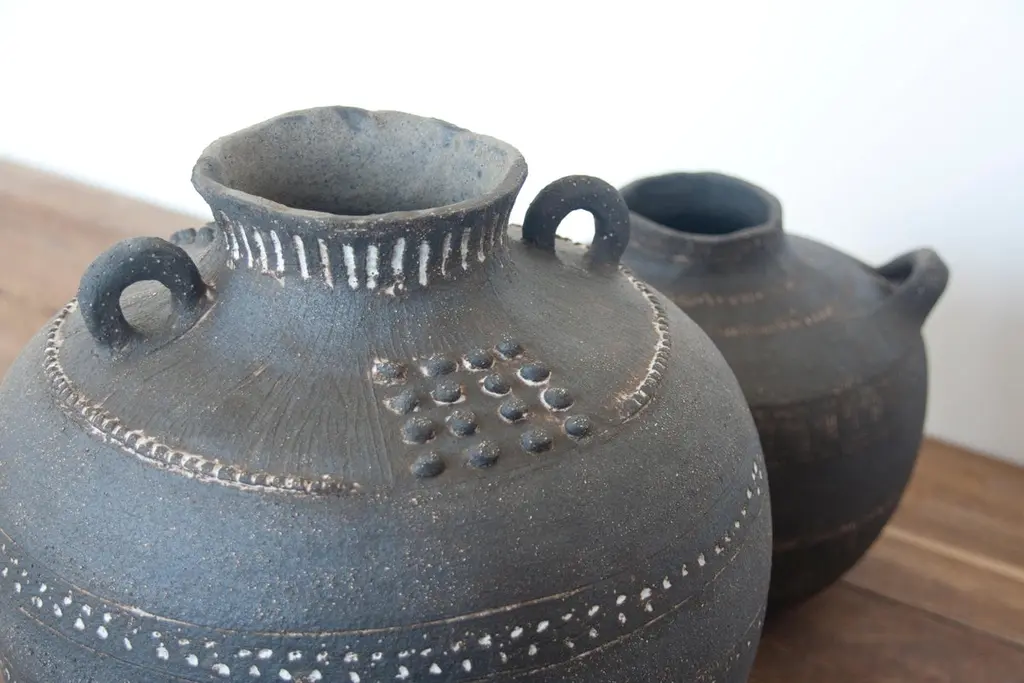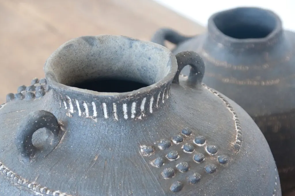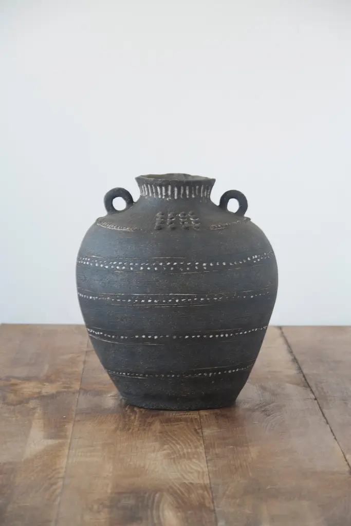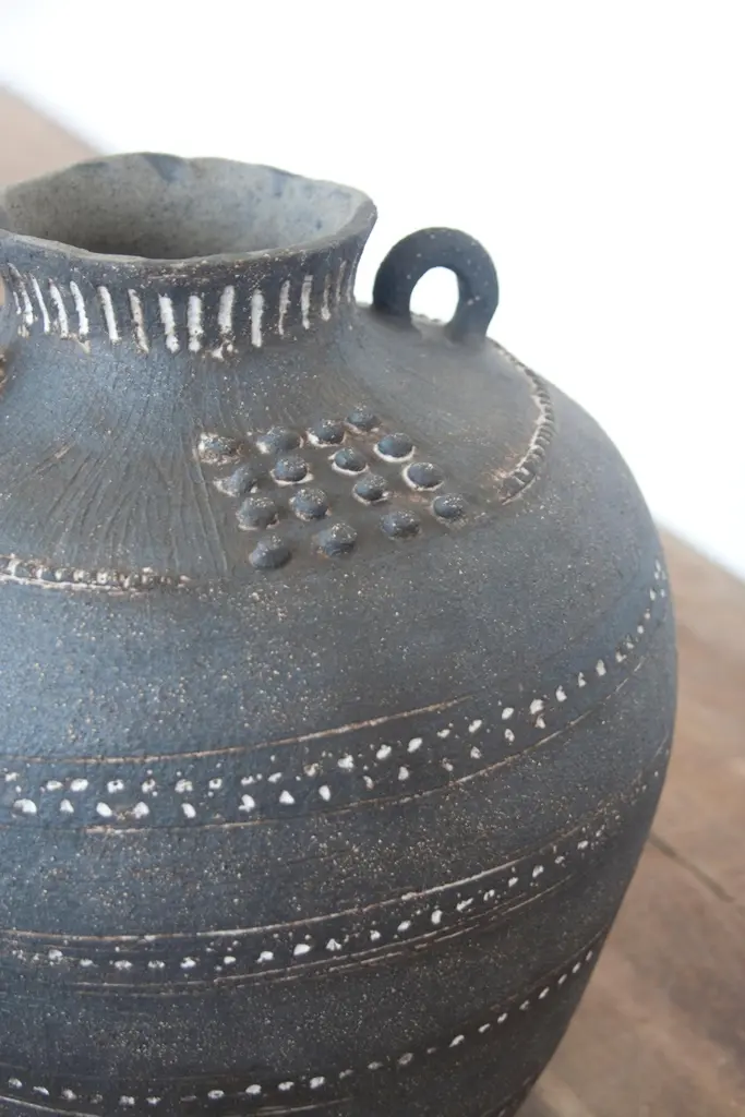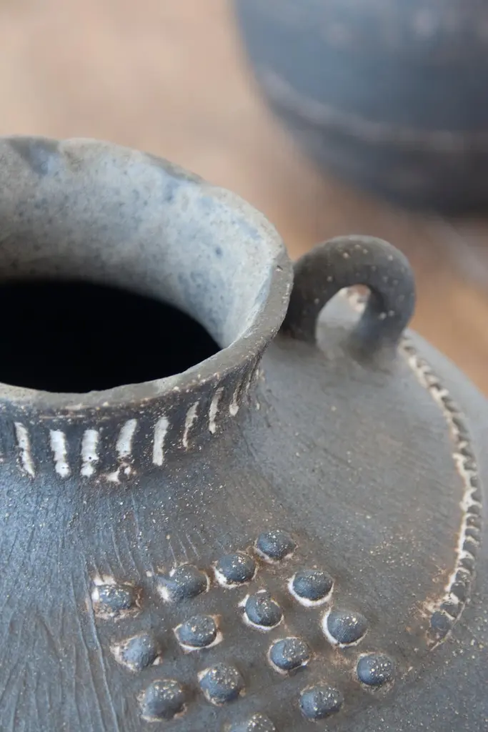 Button vase by Eguzkiñe EgañaUnique Piece.Dimensions: Ø 30 x 34.5 cm.Materials: Stoneware and enamel.Eguzkiñe Egaña Corta studied advertising and for more than 20 years has worked as a graphic designer. About 12 years ago, surrounded by a completely digital world, she felt the need to create with her hands and it is from there that she took up her drawings and illustrations and began to create with ceramics. She has completed a Master’s degree at the University of the Basque Country: “Ceramics; art and function” and combines her work as a designer and illustrator with contemporary artistic creation. She also teaches ceramics classes at the municipal school of Zarautz, a city in the Basque Country where she lives. She feels the need to explore the re - lationship between identity and self-knowledge. Work with the concepts; interior, exterior, return, connect, ancestral and artisanal, establishing a relationship between us and our environment, as well as between us and our ancestors, either emotionally, empathetically or through objects that somehow transport us to a hypothetical place in the past, both for its aesthetics and for the ways in which they have been created. Human beings are containers of desires, fears, expectations. Sometimes it is necessary to empty ourselves of everything that clutters the mind. On many occasions the artist works with turned containers reflecting this analogy. The rope is an element that she is interested in using in these sculptures, due to its conceptual charge. Unite, tie, join, analogies that the artist compares with the force of love that transcends life and death and that unites the past, the present and the future.