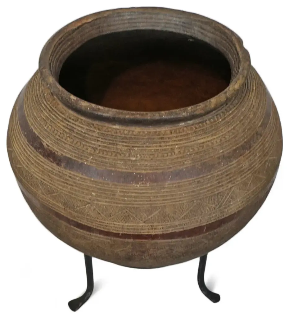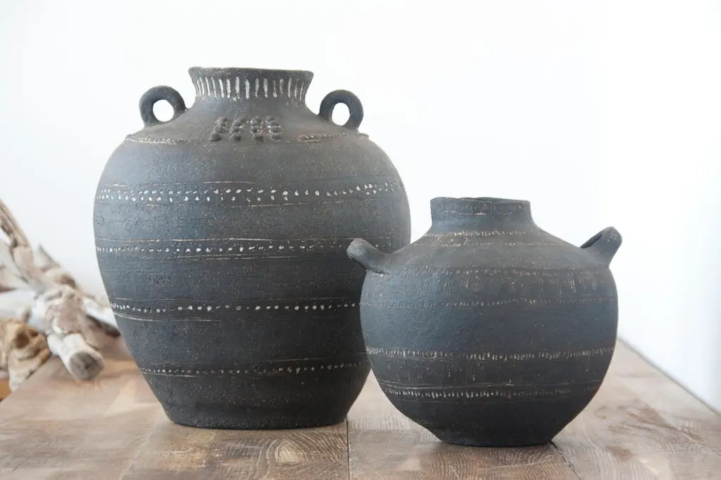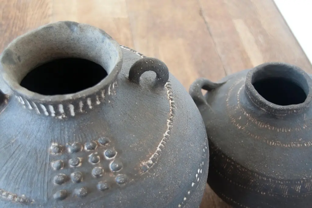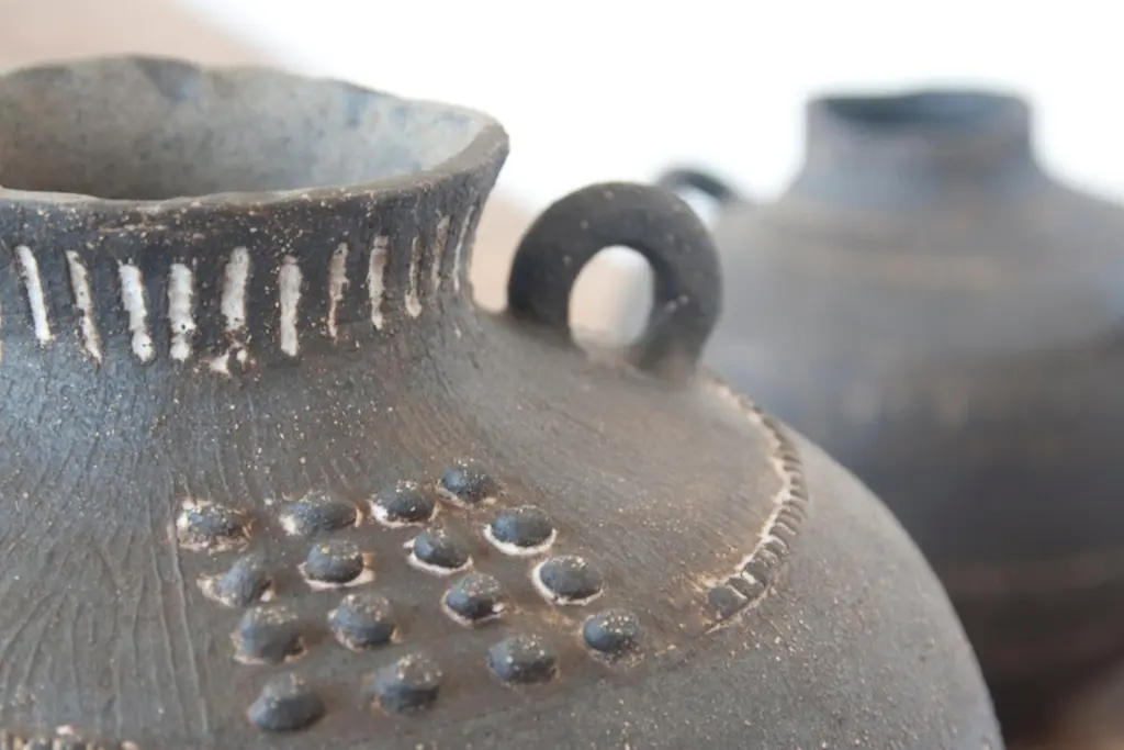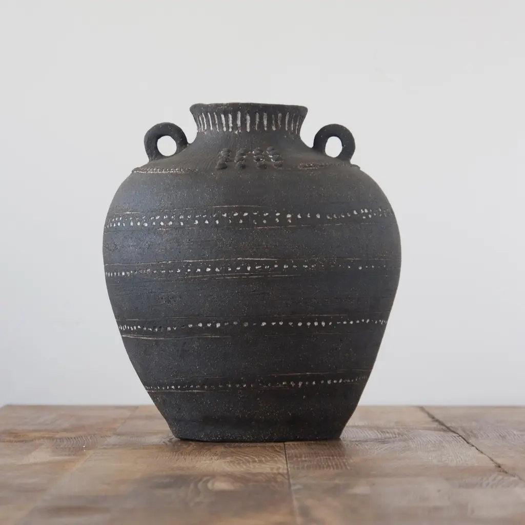 Button vase by Eguzkiñe EgañaUnique Piece.Dimensions: Ø 30 x 34.5 cm.Materials: Stoneware and enamel.Eguzkiñe Egaña Corta studied advertising and for more than 20 years has worked as a graphic designer. About 12 years ago, surrounded by a completely digital world, she felt the need to create with her hands and it is from there that she took up her drawings and illustrations and began to create with ceramics. She has completed a Master’s degree at the University of the Basque Country: “Ceramics; art and function” and combines her work as a designer and illustrator with contemporary artistic creation. She also teaches ceramics classes at the municipal school of Zarautz, a city in the Basque Country where she lives. She feels the need to explore the re - lationship between identity and self-knowledge. Work with the concepts; interior, exterior, return, connect, ancestral and artisanal, establishing a relationship between us and our environment, as well as between us and our ancestors, either emotionally, empathetically or through objects that somehow transport us to a hypothetical place in the past, both for its aesthetics and for the ways in which they have been created. Human beings are containers of desires, fears, expectations. Sometimes it is necessary to empty ourselves of everything that clutters the mind. On many occasions the artist works with turned containers reflecting this analogy. The rope is an element that she is interested in using in these sculptures, due to its conceptual charge. Unite, tie, join, analogies that the artist compares with the force of love that transcends life and death and that unites the past, the present and the future.