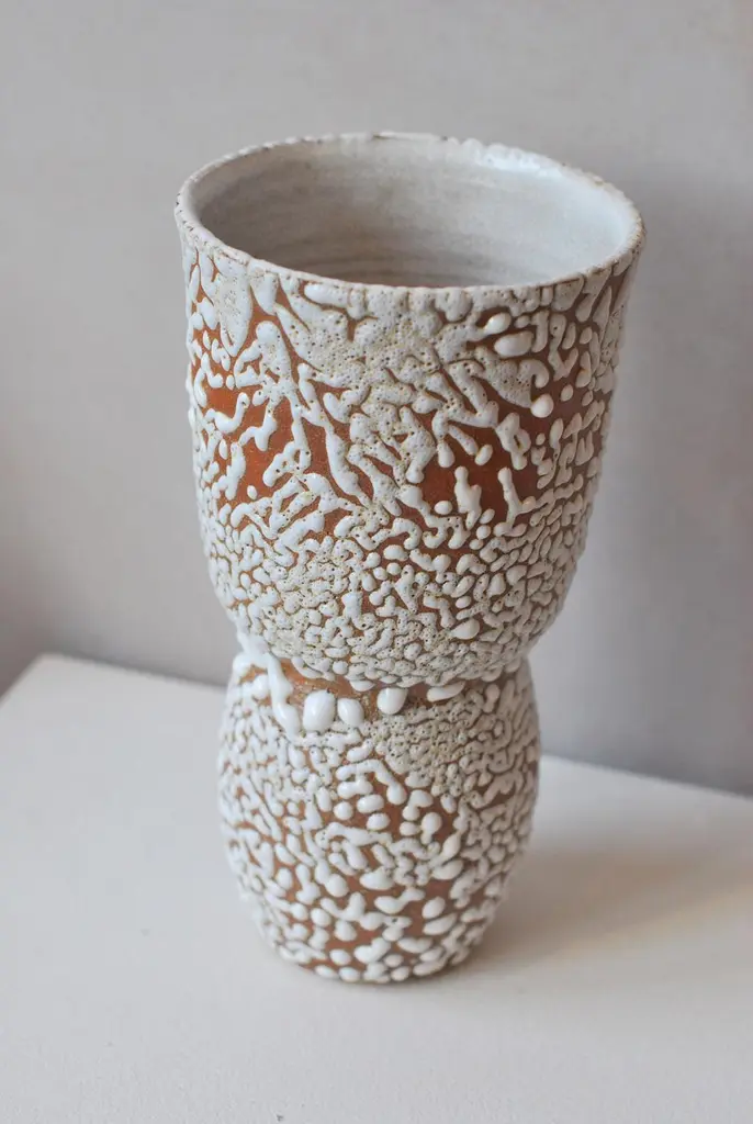 C-018 white stoneware vase by Moïo StudioDimensions: D12 x W12 x H25 cmMaterials: White crawl glaze on tan stonewareMade by hand on the wheelUnique piece, consult for multiplesIs the Berlin-based ceramic art studio of French-Palestinian artist Maia Beyrouti. It was created in 2016 as a result of the desire to work largely in clay and develop a body of work investigating the role of objects, including sculptures, installations, and the creation of collections that bridge art, craft, and design.Maia as born in Paris, grew up in the South of France and moved to London as a teen in the 1990s. There, she studied at Chelsea, Camberwell College of Arts & Crafts, and LCC. She is now based in Berlin, Germany since 2009.With an eclectic background in Conservation, Historical & Cultural studies as well as visual communication, she nurtured a multi-disciplinary approach to her art, which includes painting, writing, sounds and ceramics. Her ceramic work mixes wheel-work and hand building techniques.