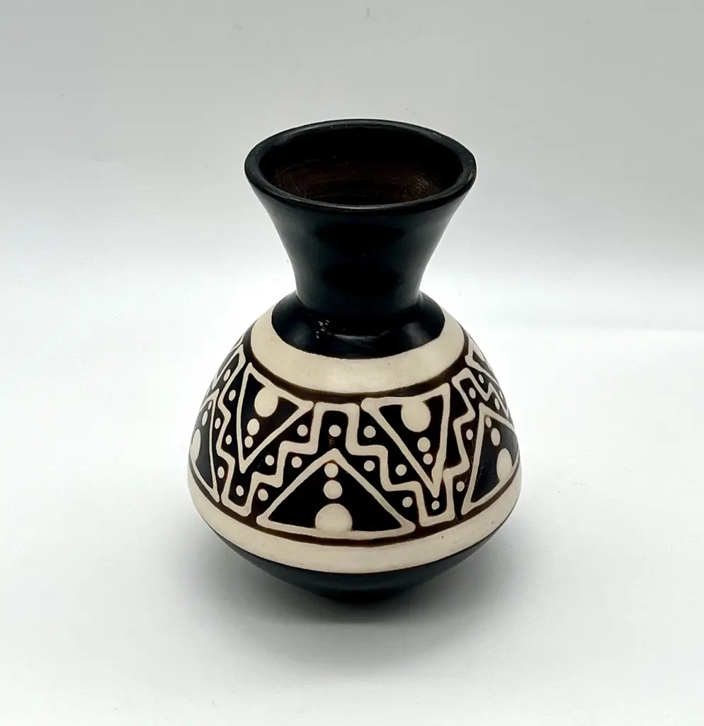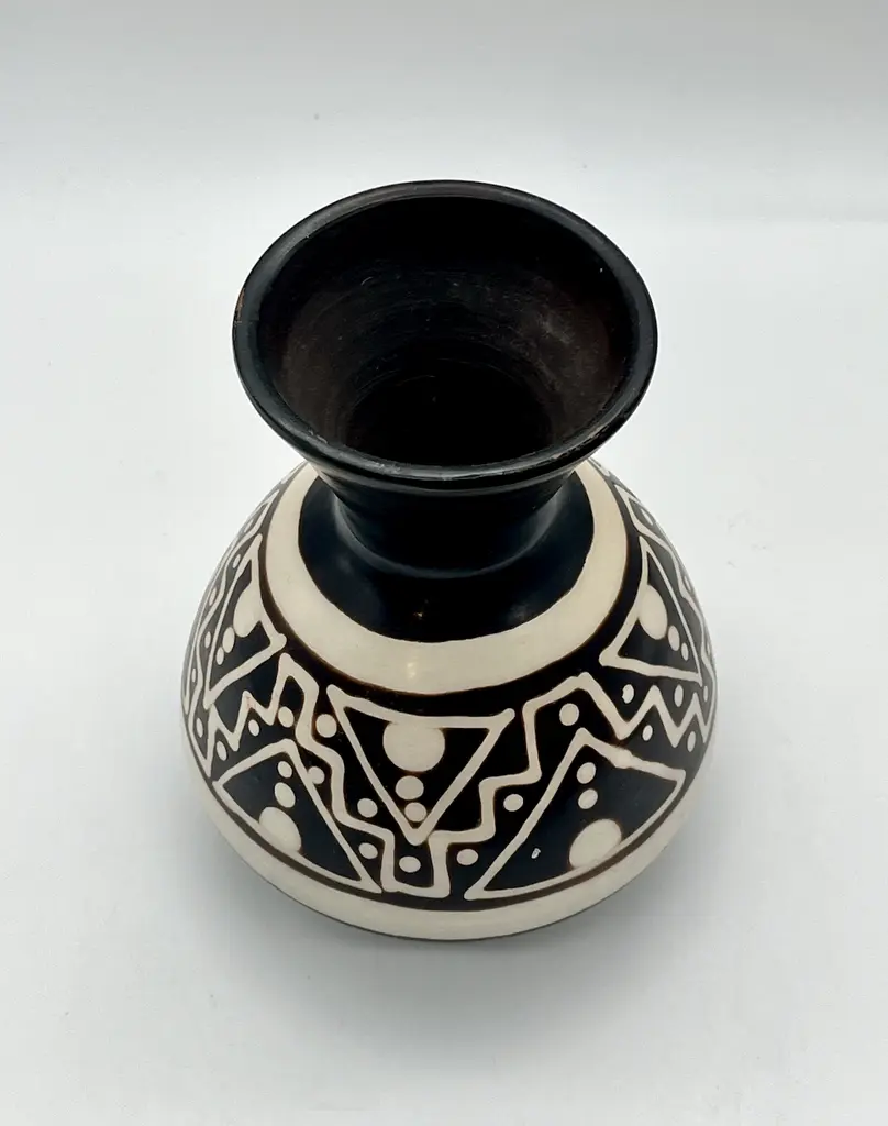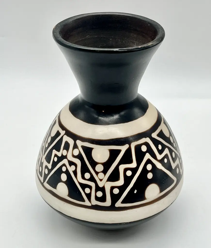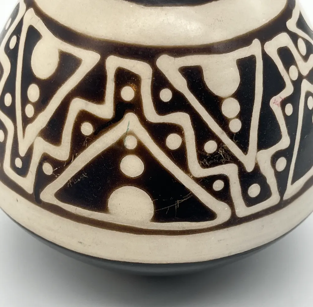 Mid-Century Modern c. 1970s dark brown ceramic vase with off-white abstract geometric patterned central band.