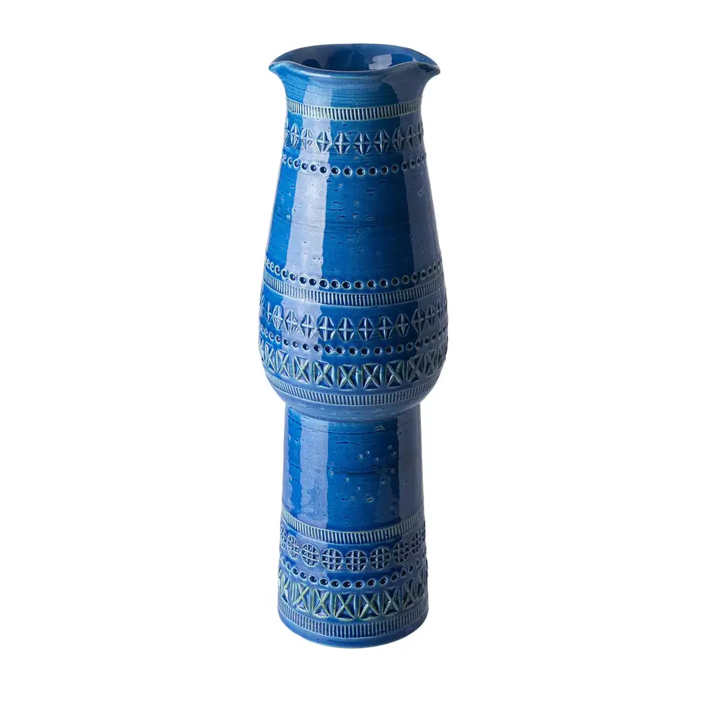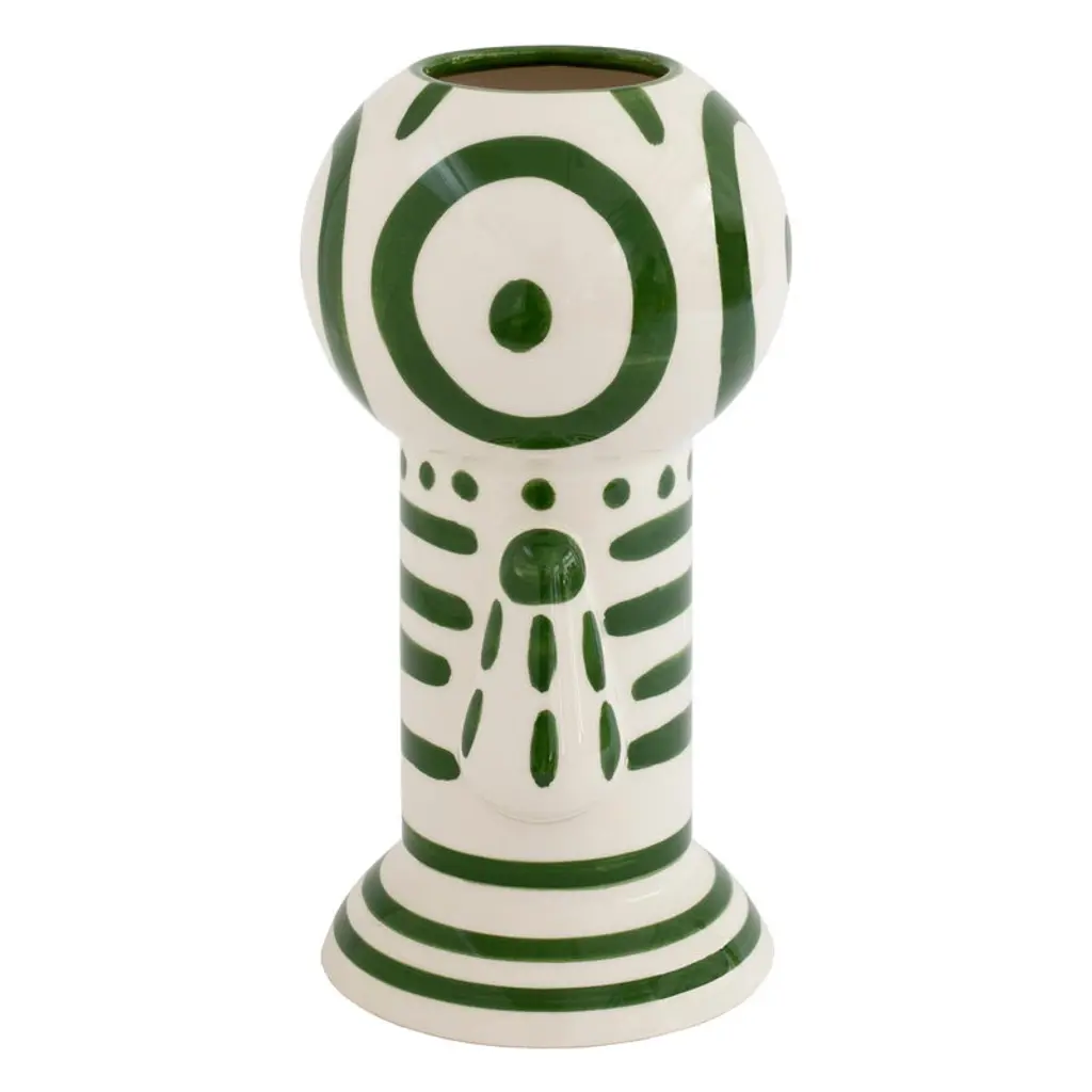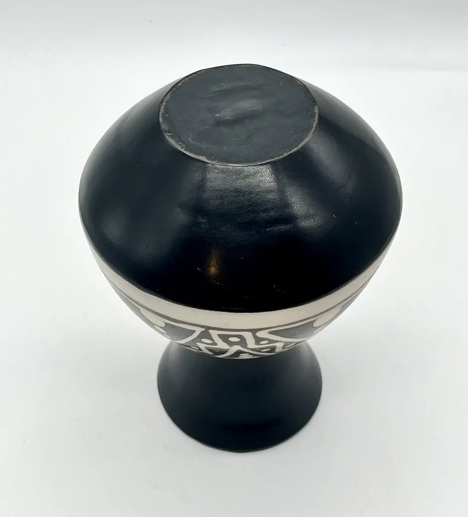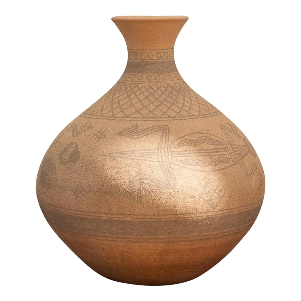 Mid-Century Modern c. 1970s dark brown ceramic vase with off-white abstract geometric patterned central band.