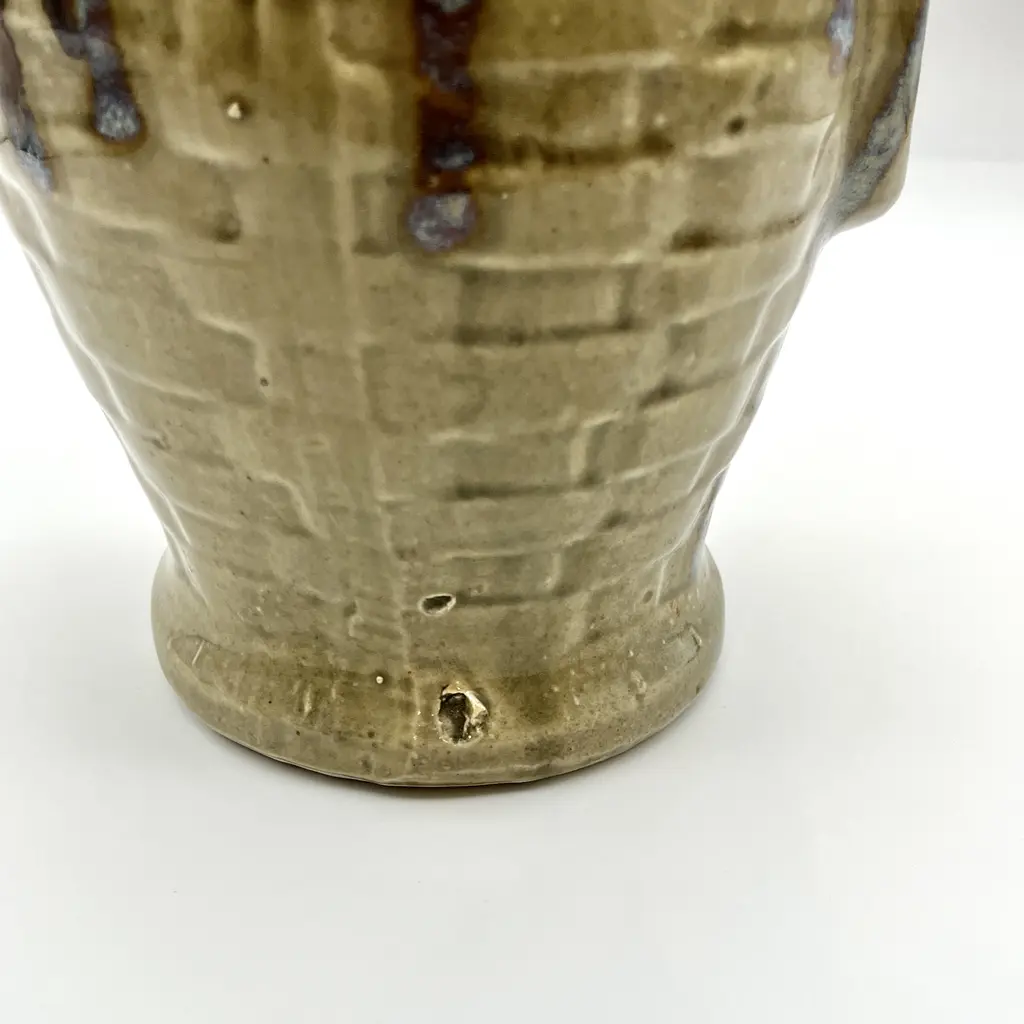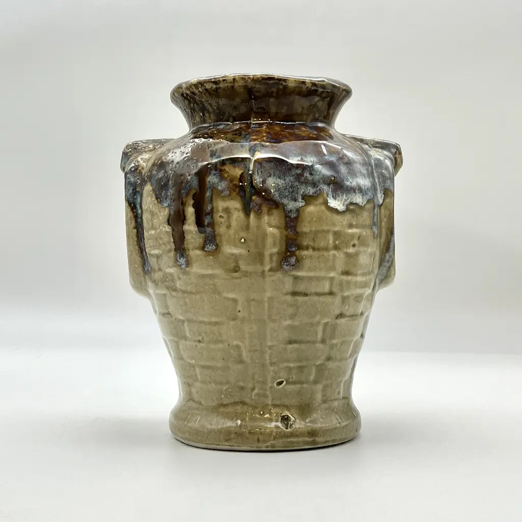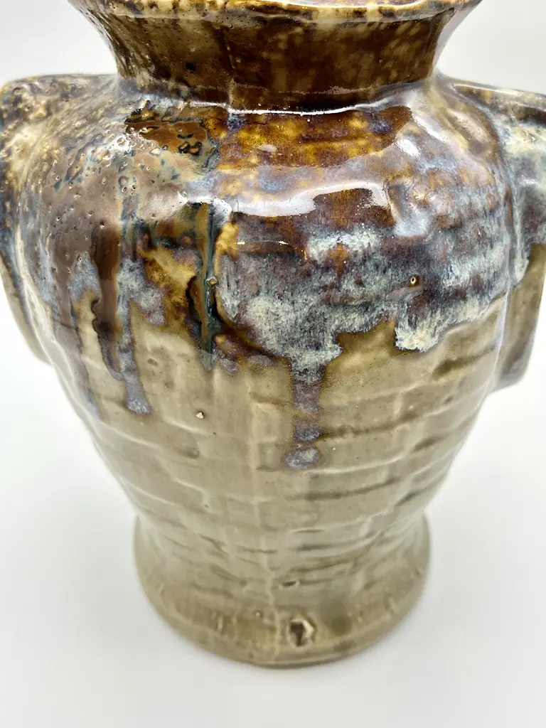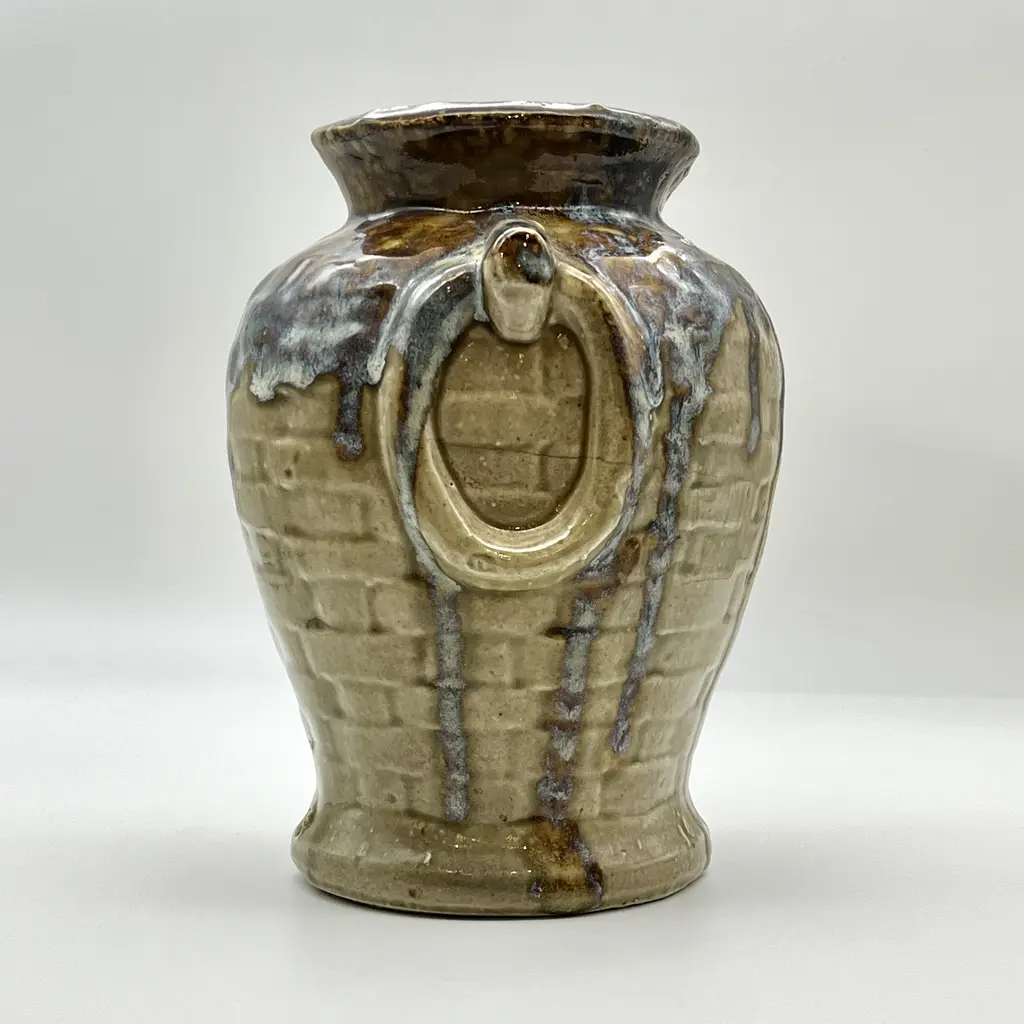 Mid-Century Modern c. 1970s faux-handled and basket weave drip glazed ceramic vase. Light brown base color with drip glaze in dark brown and varying tones of blue and gray.