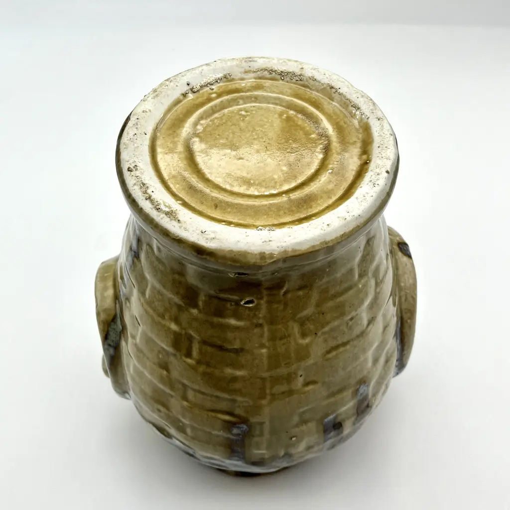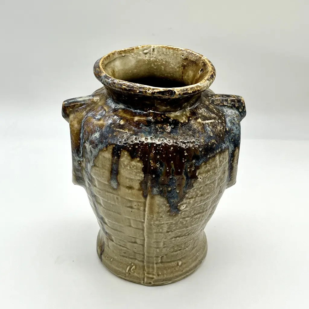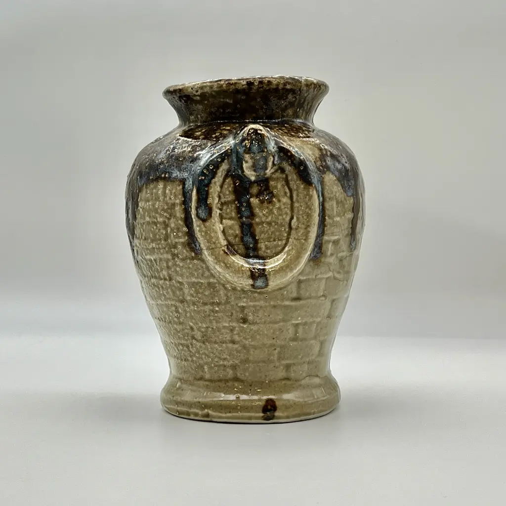 Mid-Century Modern c. 1970s faux-handled and basket weave drip glazed ceramic vase. Light brown base color with drip glaze in dark brown and varying tones of blue and gray.