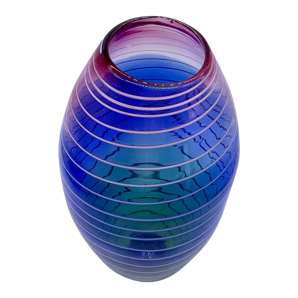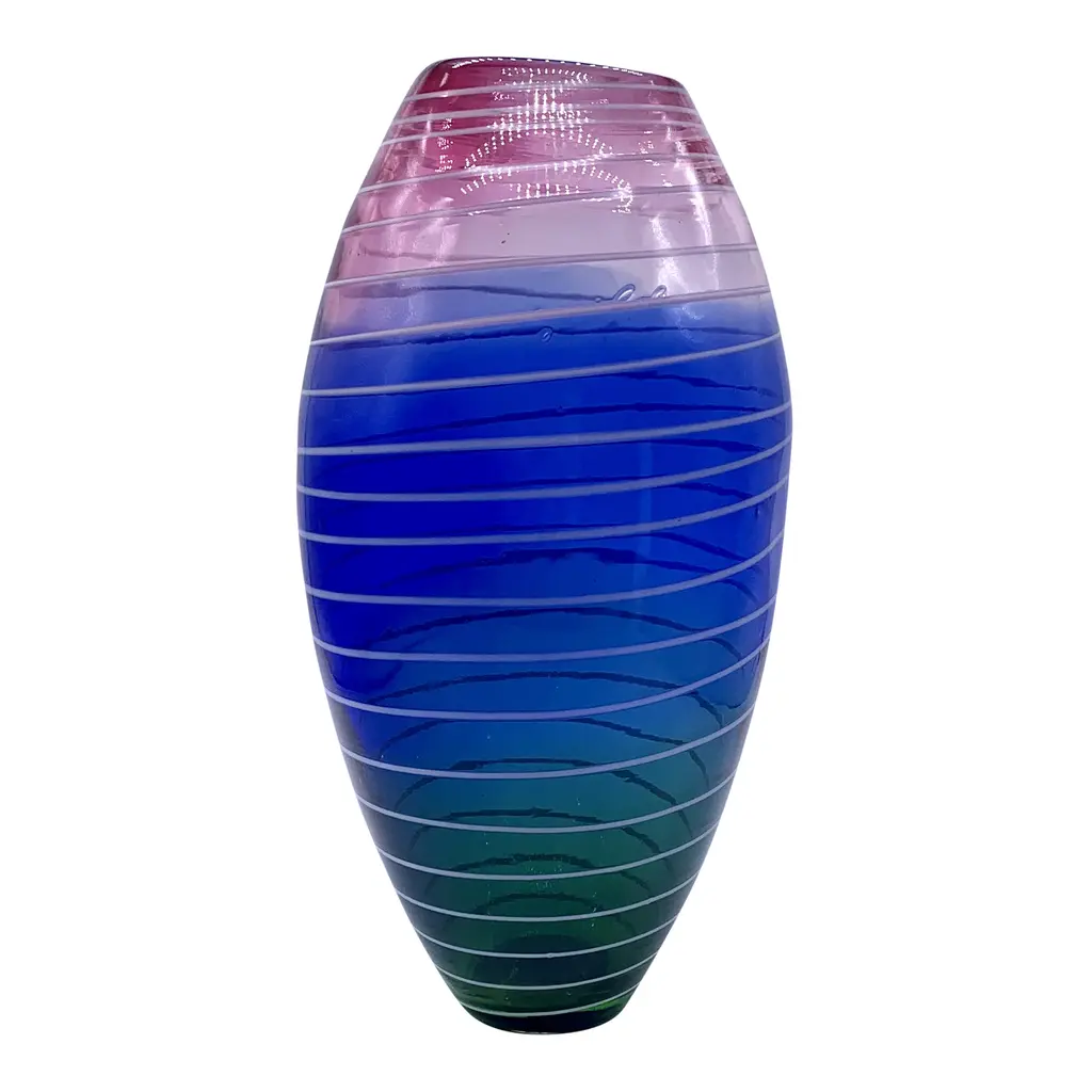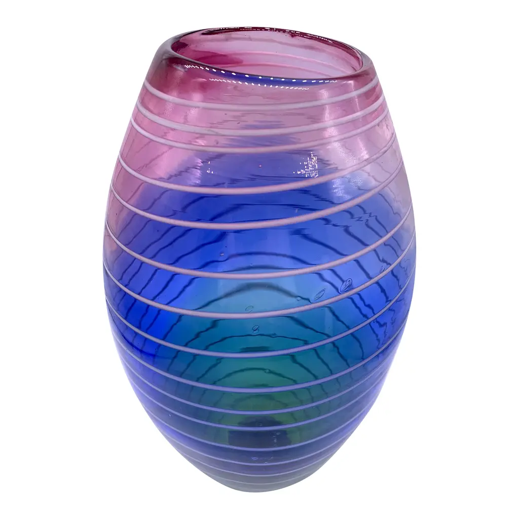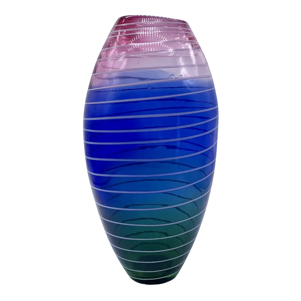 Tall and substantial c. 1980s statement art glass vase in multi-colored variegated tones of dark pink, blue and green with overall white striation. 13"H x 6.6"Dia. (at widest point) x 3"Dia. (at top). Excellent condition.