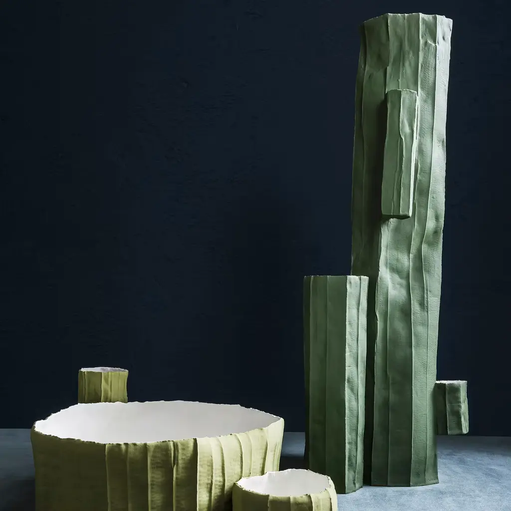 This unique vase was handcrafted using paper clay, a clay-base mixture enriched with natural fibers. The final firing phase results in the distinctive, light-yet-strong appearance and captivating look. Handcrafted and hand painted in vivid green, this vase is composed of four cylindrical elements with a ridged surface. This remarkable piece is part of the Cactus series of decorative objects that are not only pieces of functional interior design but first and foremost sculptural works of art. Every one of Paola Paronetto’s creations is unique. Slight variations in shape, colour and size are to be considered a guarantee of authenticity and value. They are finished with non-toxic satin-finish enamels. Although very rarely, it is possible for them to leak after long periods of exposure to water. It is therefore advisable to test their water resistance before using them on delicate surfaces. They should not be used as dining utensils. The white pieces can be washed with water or sanitizing products, whereas the coloured pieces must be treated more gently and cleaned with a feather duster or a soft cloth, dry or moistened very slightly with water.