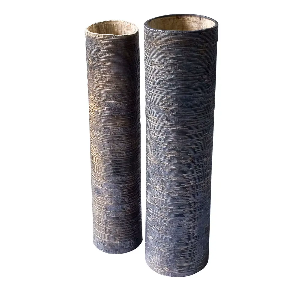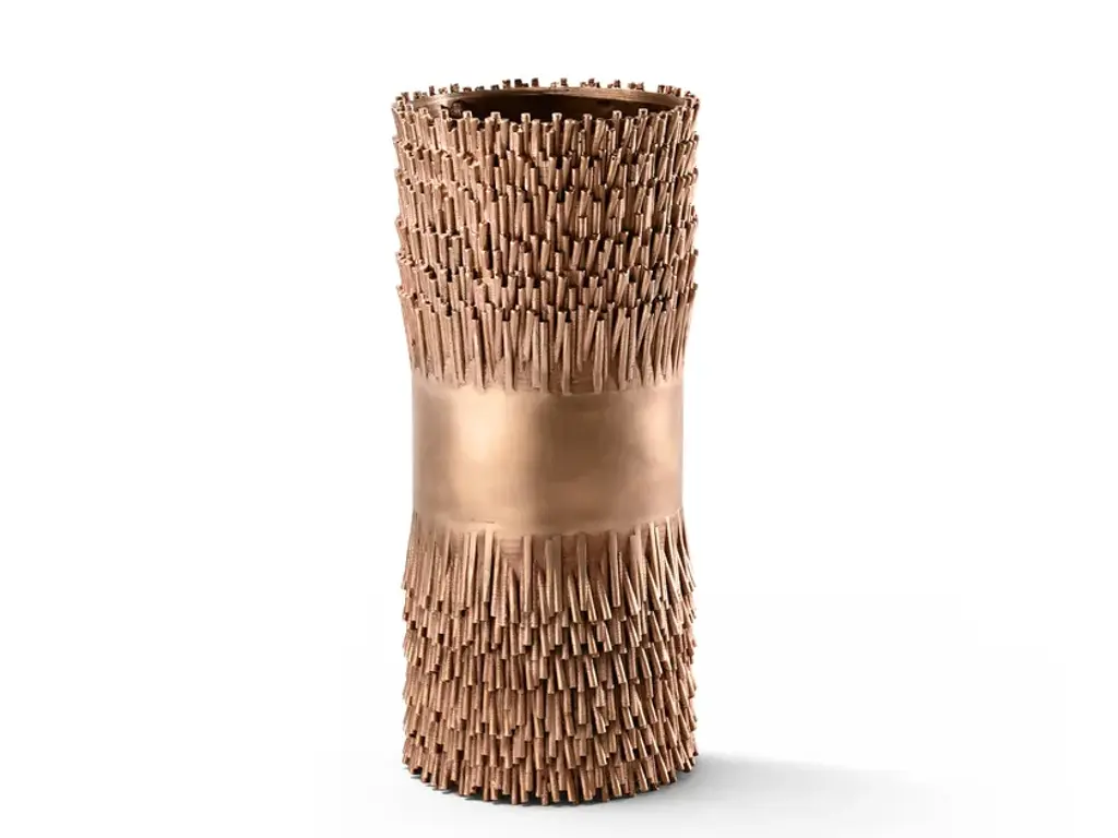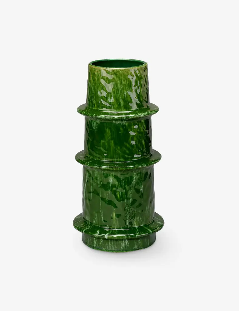 Italian ceramist Paola Paronetto's Cactus series of decorative objects draws inspiration from the beauty and harmony in nature. Handcrafted of paper clay, a special material obtained by mixing paper pulp and particles of vegetable fibers to the ceramic base, this unique vase is composed of three cylindrical elements whose surface is marked by delicate and irregular vertical ridges on a dark forest green surface. Every one of Paola Paronetto’s creations is unique. Slight variations in shape, colour and size are to be considered a guarantee of authenticity and value. They are finished with non-toxic satin-finish enamels. Although very rarely, it is possible for them to leak after long periods of exposure to water. It is therefore advisable to test their water resistance before using them on delicate surfaces. They should not be used as dining utensils. The white pieces can be washed with water or sanitizing products, whereas the coloured pieces must be treated more gently and cleaned with a feather duster or a soft cloth, dry or moistened very slightly with water.