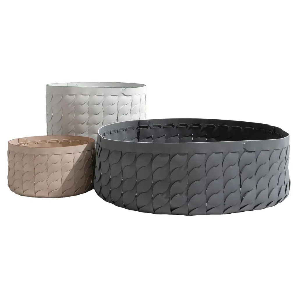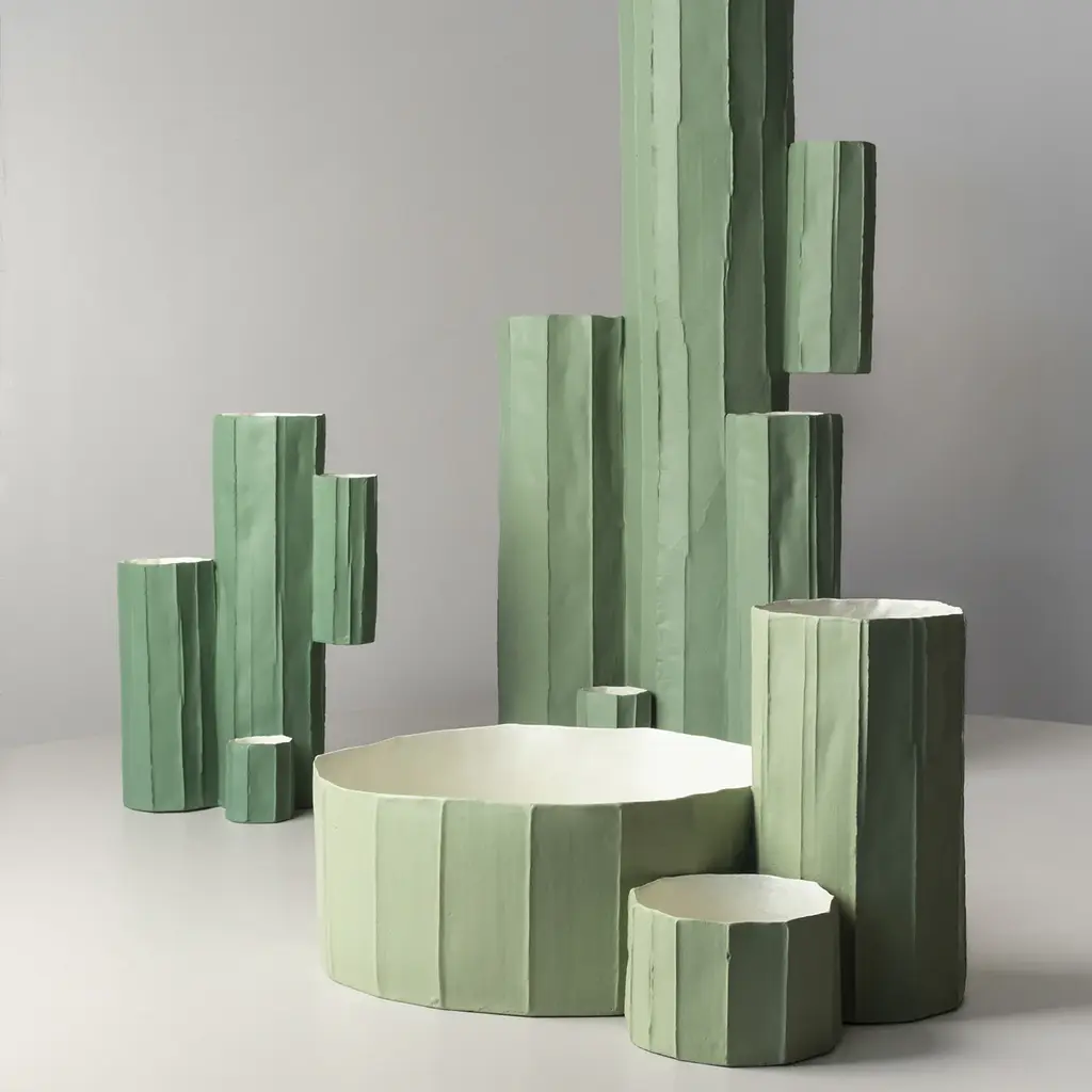 This stunning handcrafted low vase is composed of four cylindrical elements of different sizes that evoke the shape of a cactus with an external ridged surface in a delicate shade of green and white interior. The light and textured appearance is obtained using a special technique that involves the addition of cellulose (paper pulp and natural fibers) to the ceramic mixture, producing a delicate and light appearance to the finished product after the final firing. Every one of Paola Paronetto’s creations is unique. Slight variations in shape, colour and size are to be considered a guarantee of authenticity and value. They are finished with non-toxic satin-finish enamels. Although very rarely, it is possible for them to leak after long periods of exposure to water. It is therefore advisable to test their water resistance before using them on delicate surfaces. They should not be used as dining utensils. The white pieces can be washed with water or sanitizing products, whereas the coloured pieces must be treated more gently and cleaned with a feather duster or a soft cloth, dry or moistened very slightly with water.