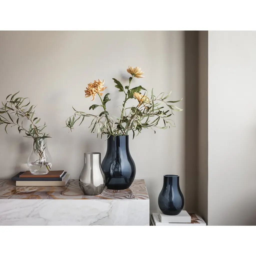 Georg Jensen's Cafu glass vase was designed by Sebastian Holmbäck and Ulrik Nordentoft. The vase's simple and beautiful form reflects the timeless quality of Georg Jensen's modern classics. A bright vase highlights the vibrant colors of flowers but will suit arrangements of plain twigs and branches as well. Combine the small vase with other items from the Cafu collection to create a harmonious composition. Cafu vases are made by mouth-blowing, so their shape and glass thickness may vary slightly, making each piece unique and beautiful.