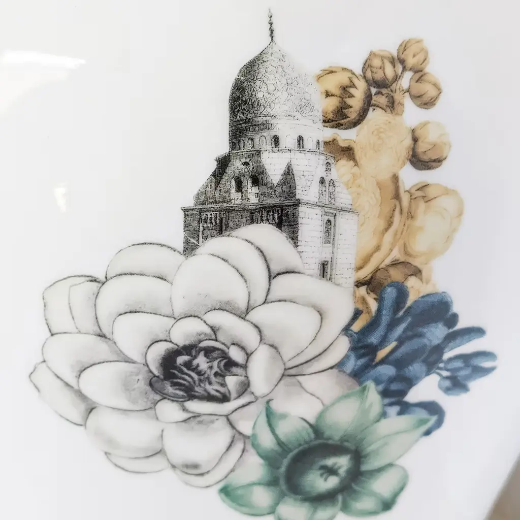 Influenced by "Paris by the Nile" architecture and its exotic subtropical flora, this stunning porcelain vase from the Grand Tour Collection by Vito Nesta features a combination of urban Middle Eastern architecture and a dreamy floral pattern. A perfect piece to display delicate flower arrangements on a dinner table, this vase will add timeless refinement to any surface it is placed on.