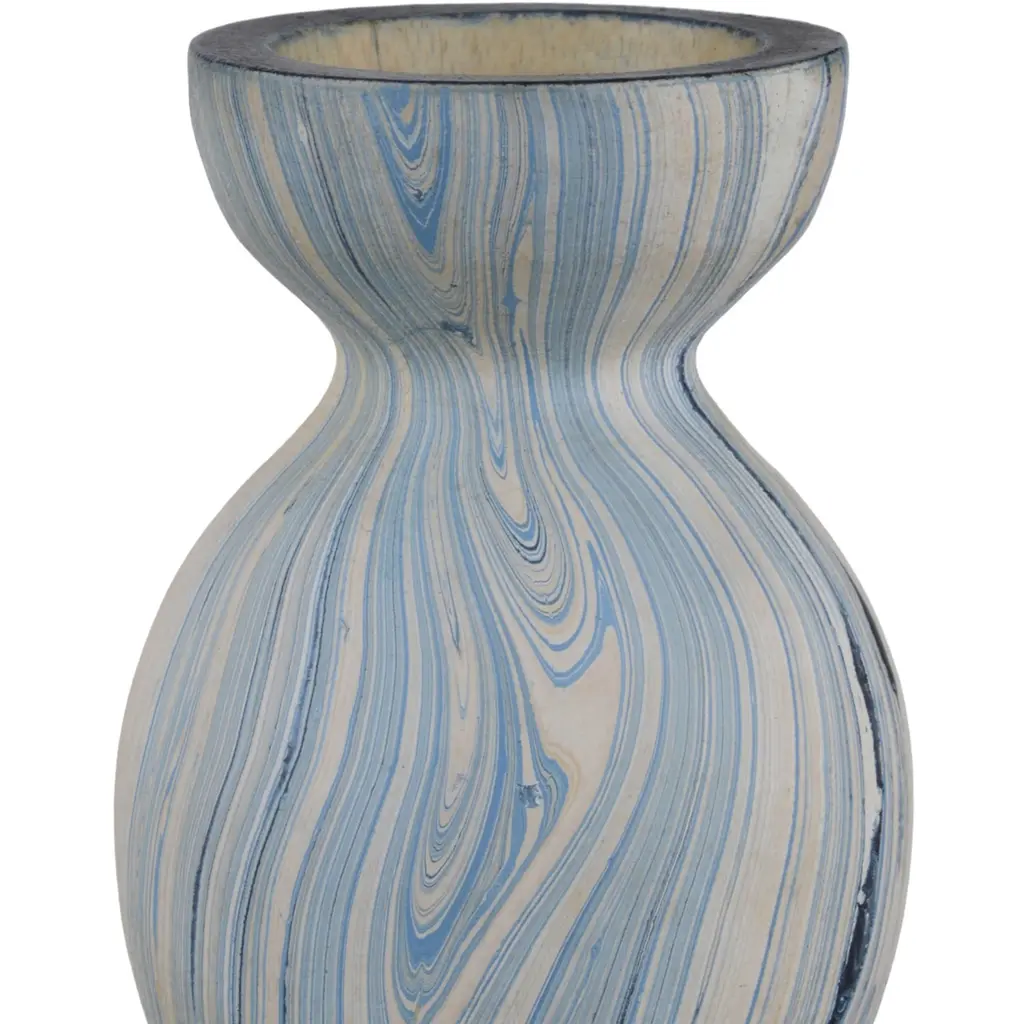 Made of wood, the Calm Sea Marbleized Vase Set includes three white and blue vases with swirling patterns along their surfaces, which have been hand-painted for a marbleized effect. The neutral tones of blue and white bring these pale blue decorative accessories a textural feel. The patterning on these multi-colored vases will make them dynamic elements in a room.