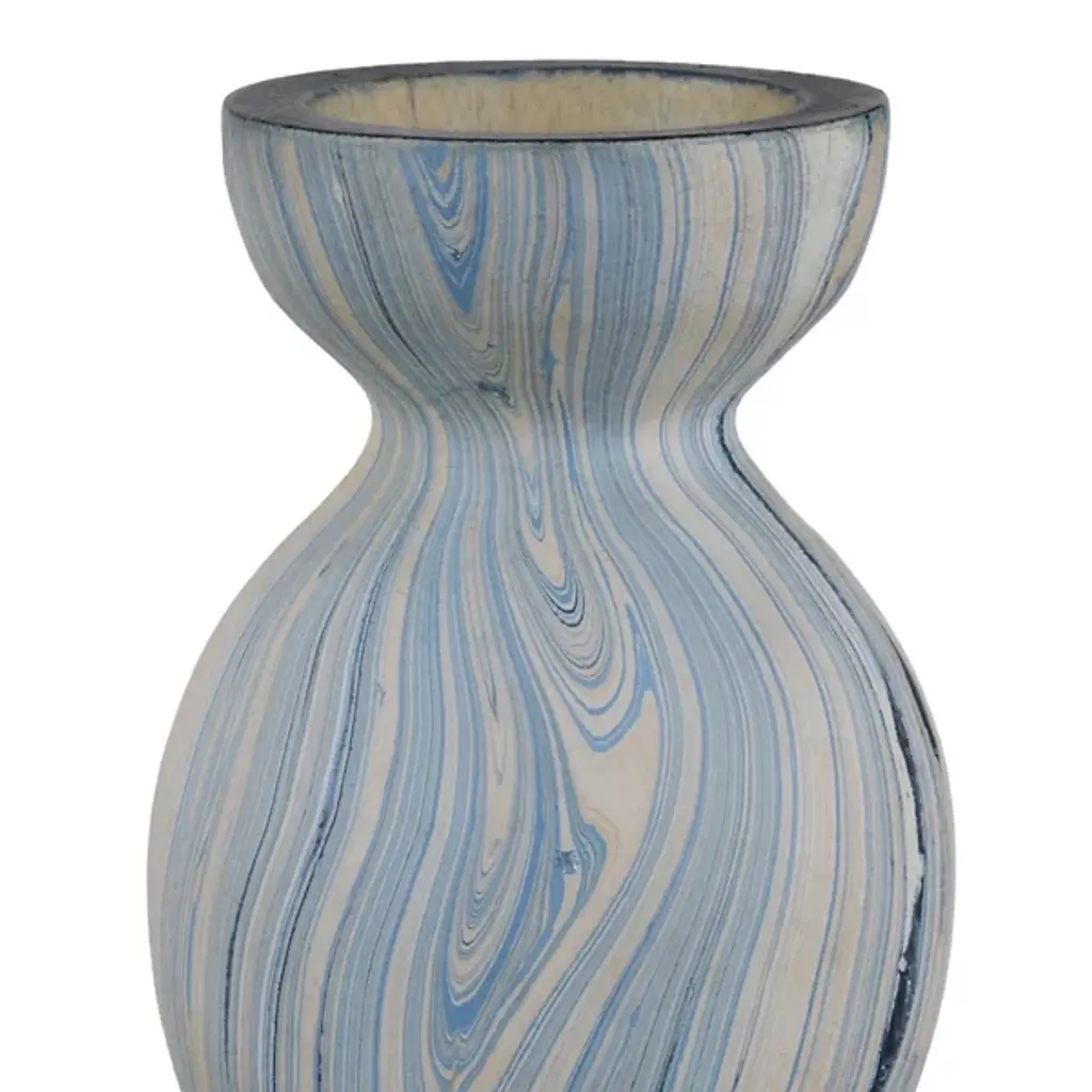 The Calm Sea Marbleized Vase Set of 3 from Currey & Company features three vases in serene white and blue tones adorned with hand-painted swirling patterns for a captivating marbleized appearance. The harmonious blend of blue and white infuses these pale blue decorative pieces with a tactile quality. The intricate patterning adds dynamism to these multi-colored vases, ensuring they become striking focal points within any space.