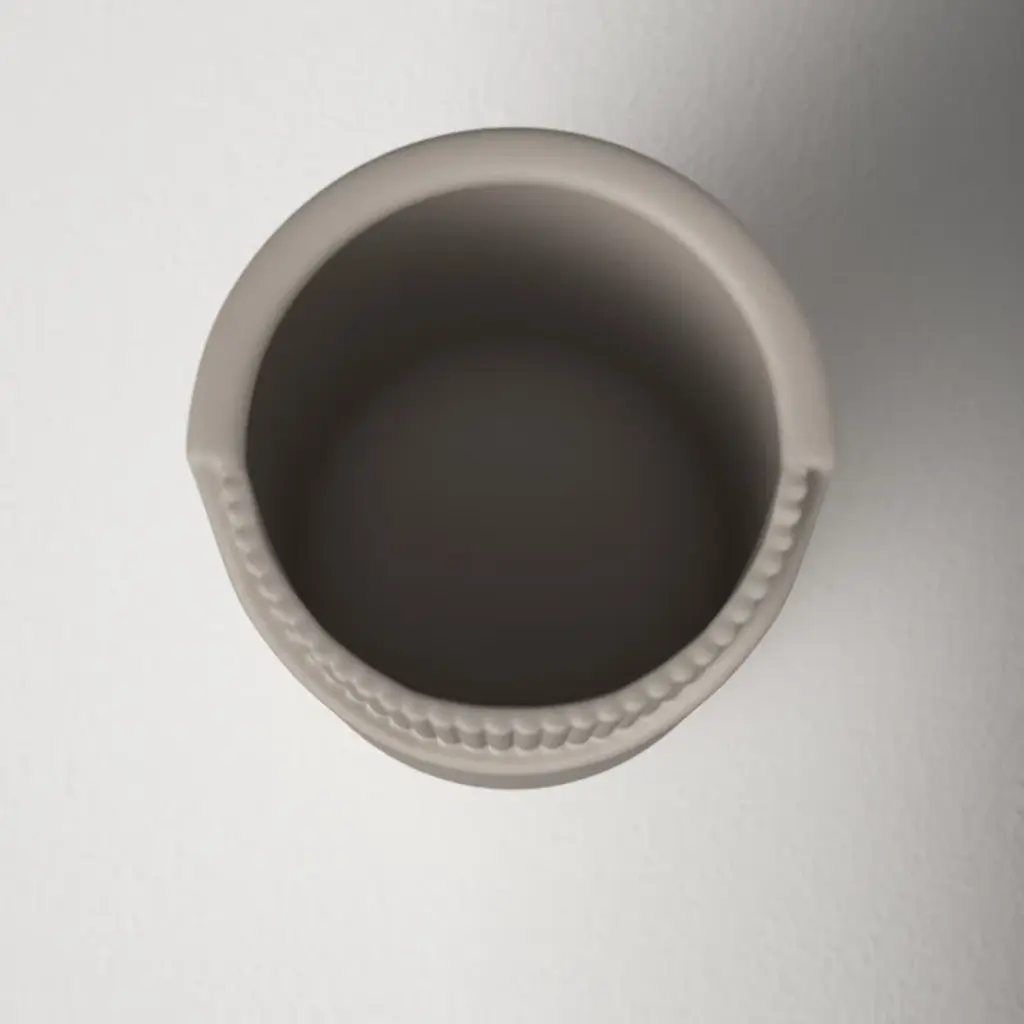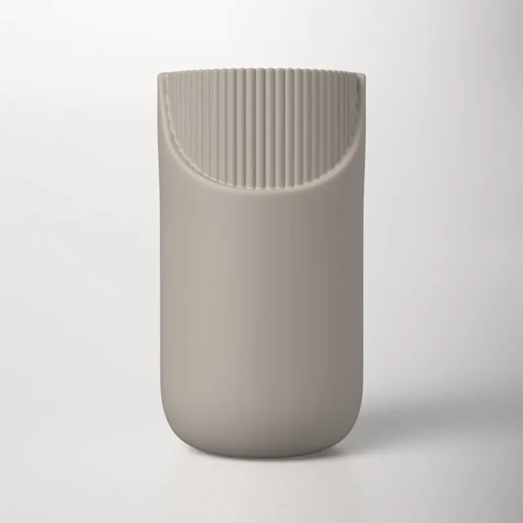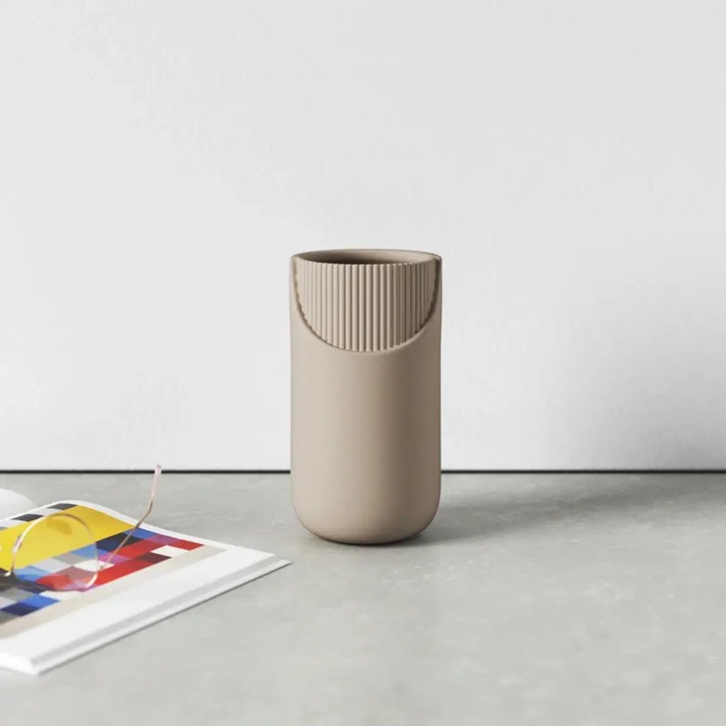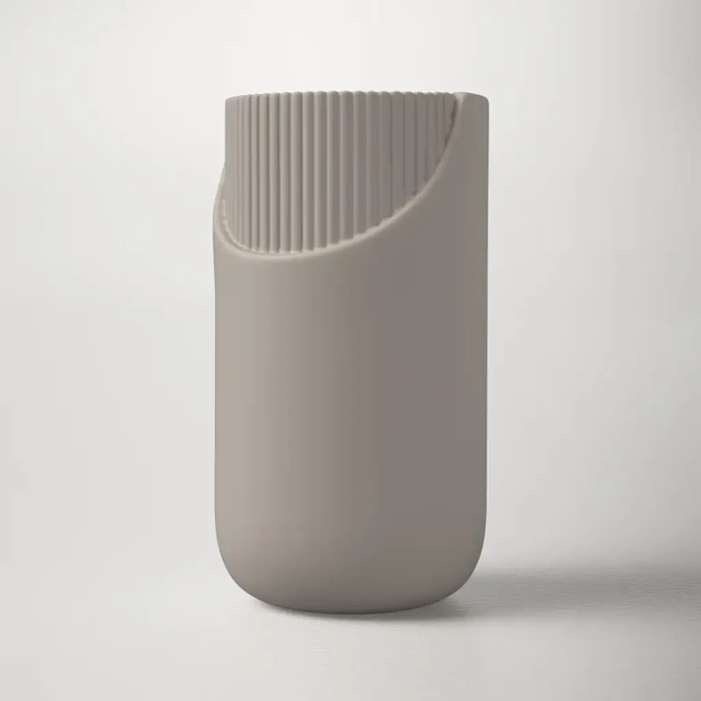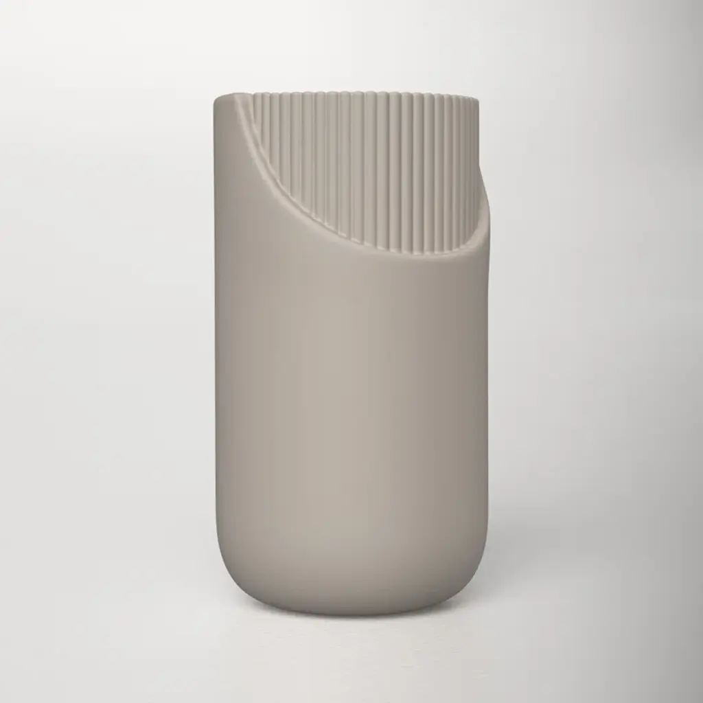 A semicircular segment of sculptural ribbing is given dramatic emphasis by this vase’s simple lines + neutral glaze. Handcrafted from sturdy ceramic, its asymmetrical design creates a fresh look from every angle – a lovely counterpoint to colorful blooms + a compelling object on its own terms.
